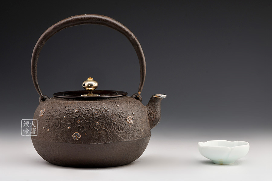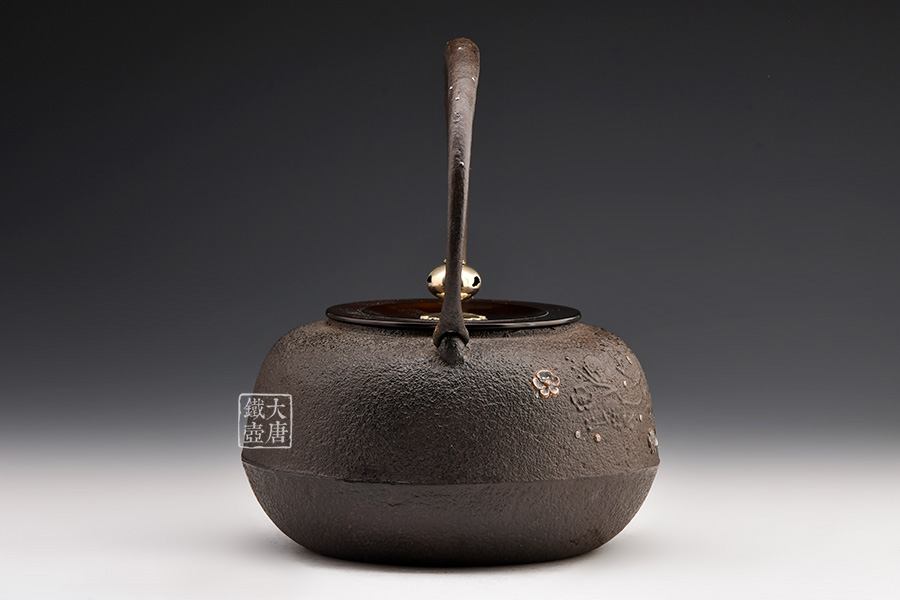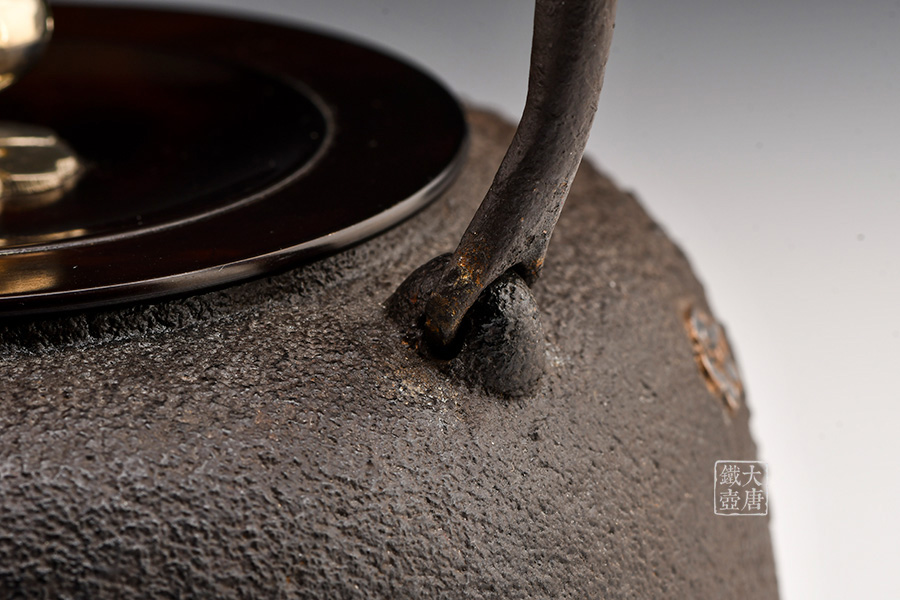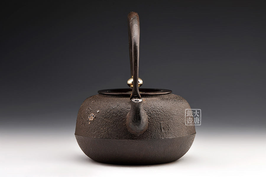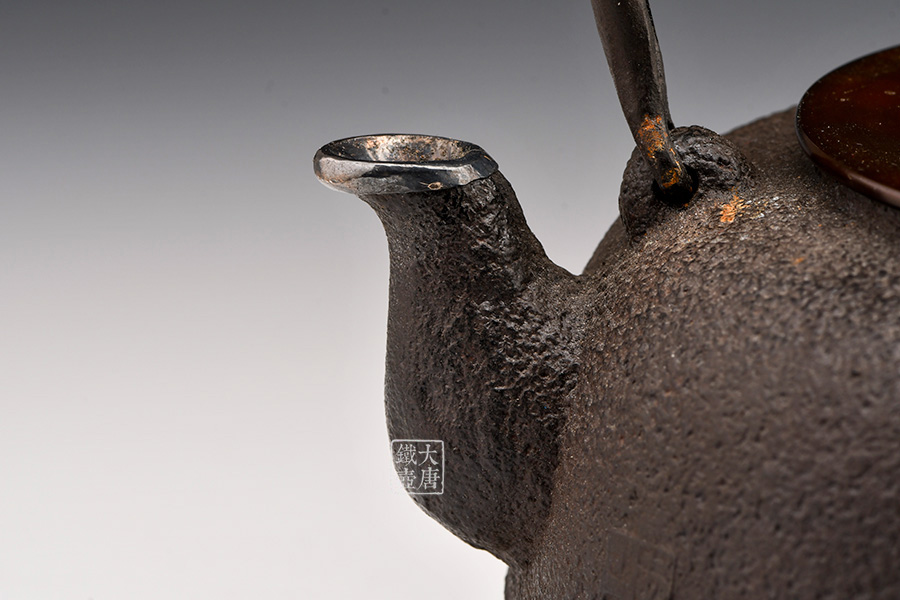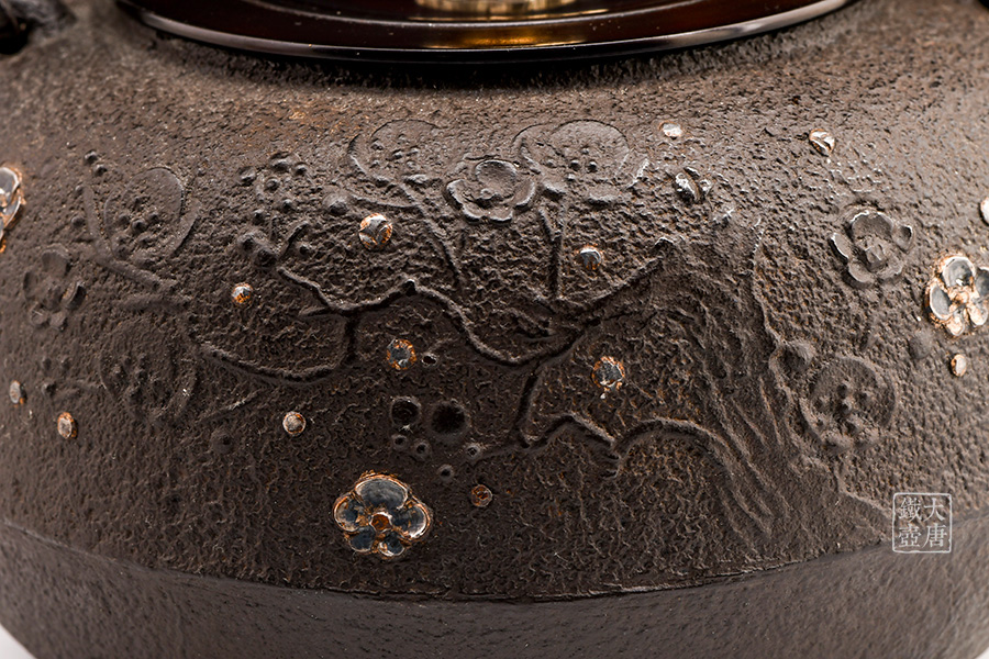 荒井工房的鐵瓶除了在鑄造工藝上有嚴格的規(guī)范和體系,在鐵瓶裝飾技術上也頗有建樹。除了傳統(tǒng)的印刻技術外,荒井工房還掌握了非常出色的金銀鑲嵌技藝,尤其以大片的鏨刻銀片最為出眾,這在山形當?shù)靥每谥歇殬湟粠谩?/p>