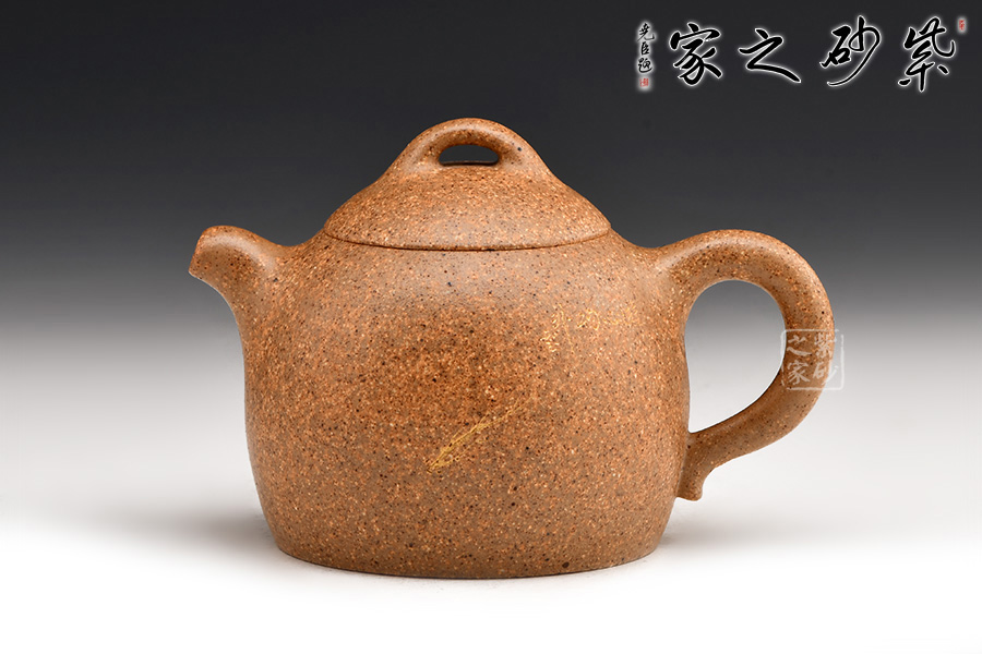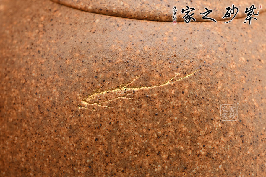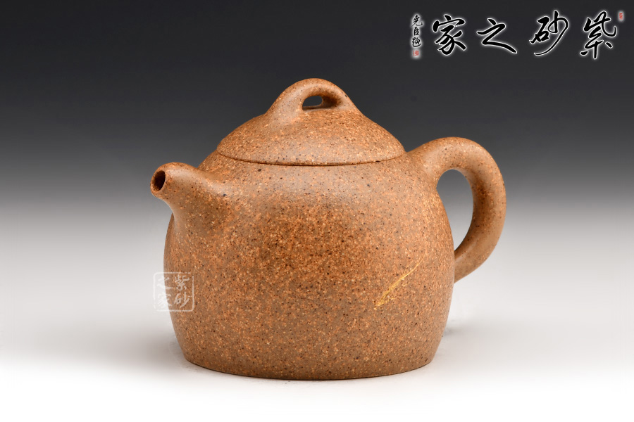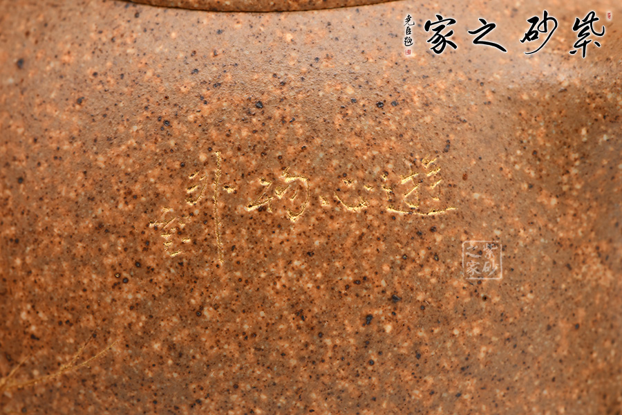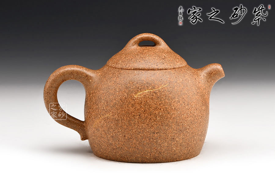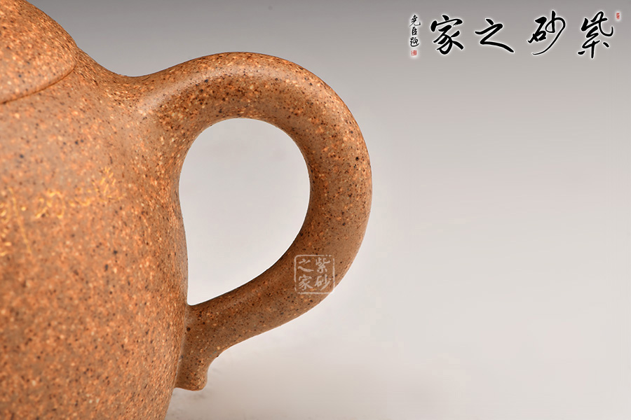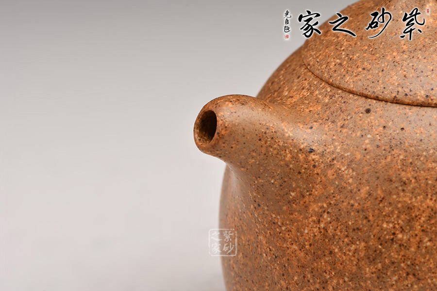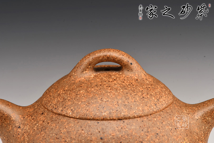 秦權(quán)壺仿秤砣形制,壺身挺拔由下至上收斂,天然流通;流短有勁,環(huán)耳形把手,不矯不揚(yáng);嵌蓋微鼓,沿蓋品天衣無縫;鈕似橋頂。整壺曲線柔和流暢,造型渾厚樸拙,簡練大方。