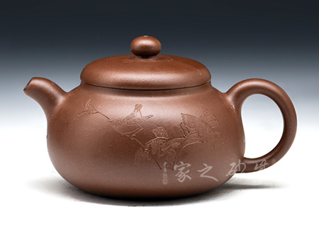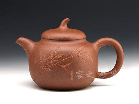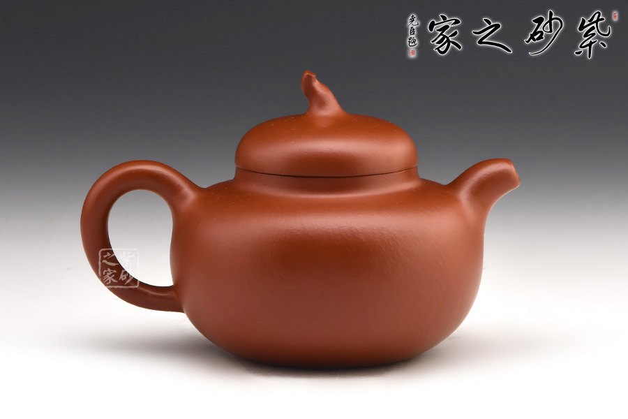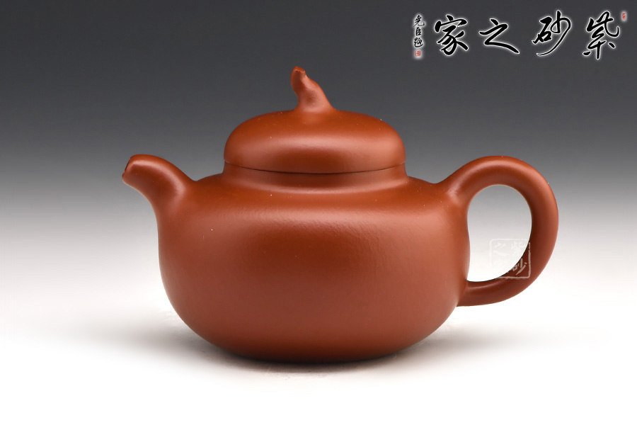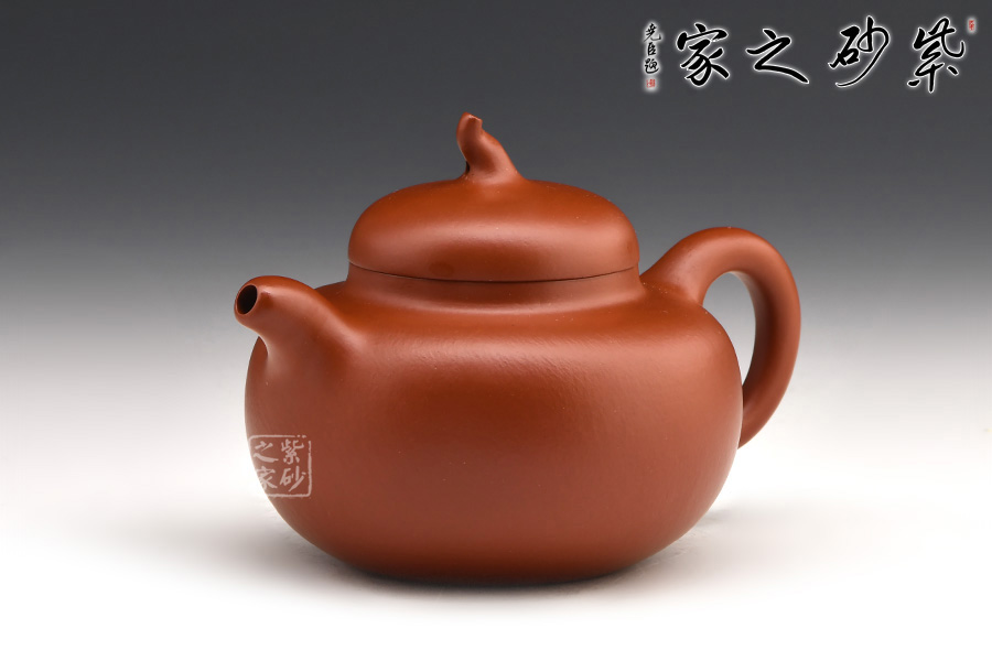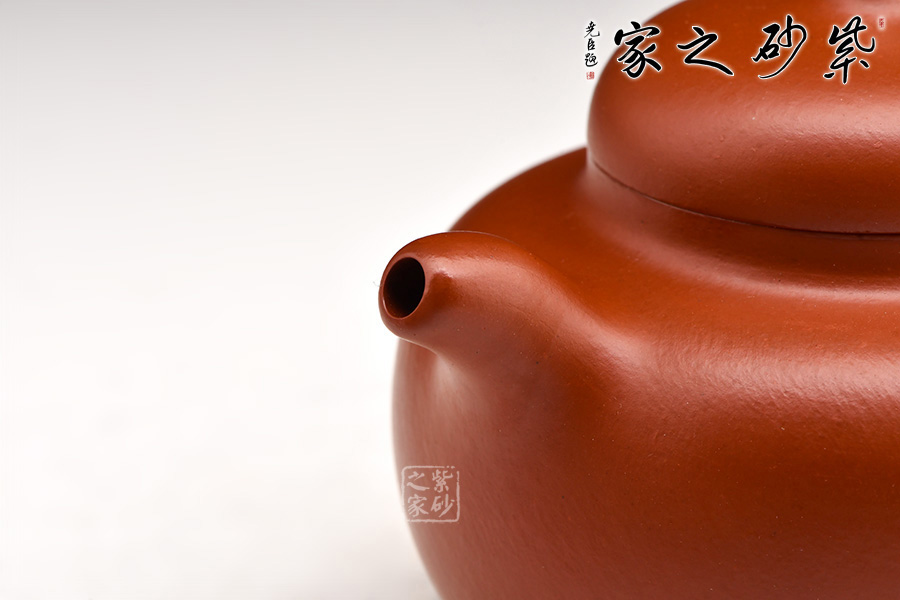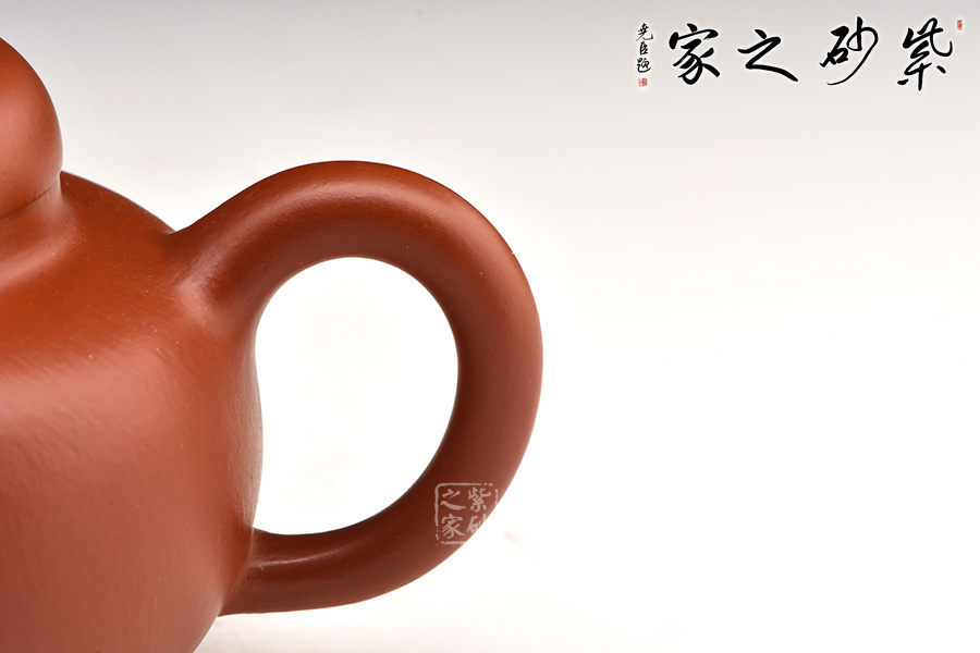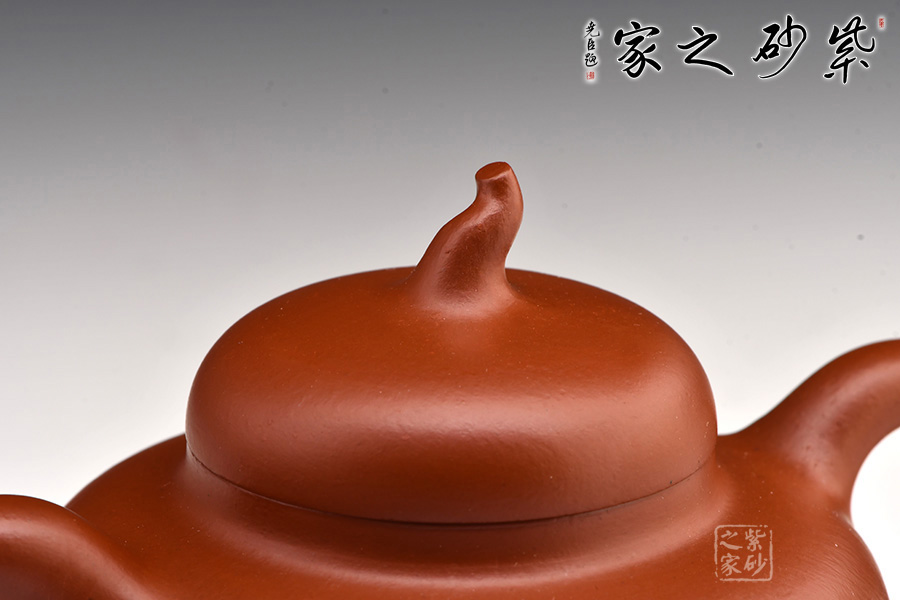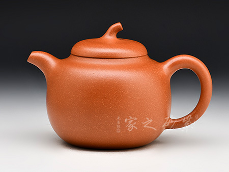 此茄段壺形飽滿圓潤,線條優(yōu)美流暢,可見精致,嬌小的壺嘴巧配小巧的壺鈕;值得一體的是,此壺的壺鈕造型自然別致如同真正的瓜果茄藤之感。微鼓的壺身田園有感,原礦朱泥為料,氣韻天然,色澤細膩,很自然的讓我們聯(lián)想到茄子本身的古樸之色,整體設(shè)計、用料皆待細細品味,可謂佳作!