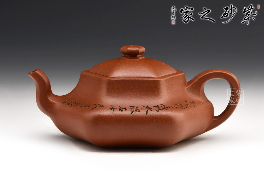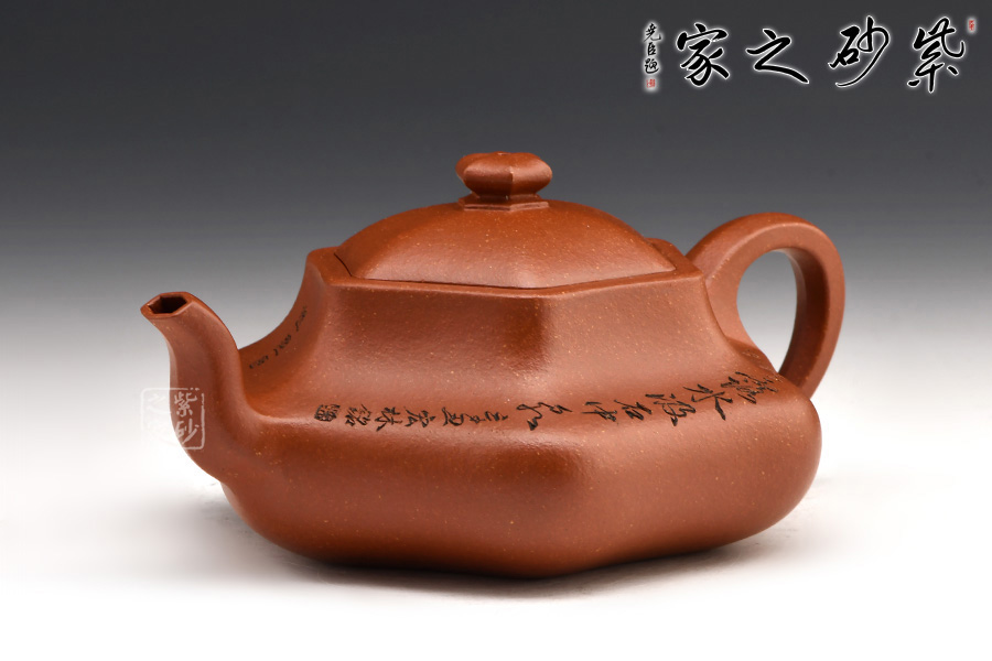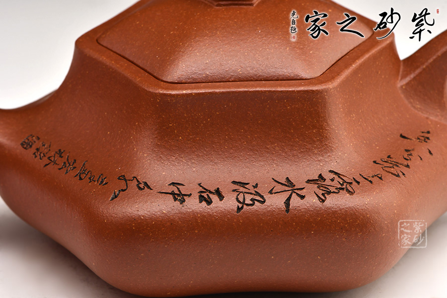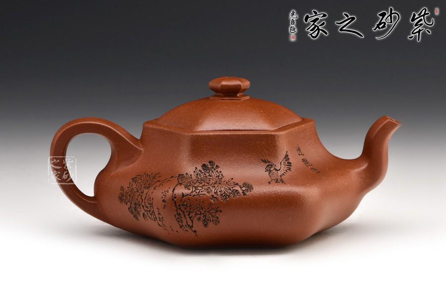 此件作品體現(xiàn)出的正是方器的要義與精粹,以方定型,曲直相濟,方中寓圓,圓中有方。閑者六方,層次感極強,舒展的壺把與窈窕的壺流,是壺提氣的關鍵。節(jié)奏與動感,充斥在每一根浸淫著個性的線條中。壺身由正高級工藝美術(shù)師陳宏林老師裝飾刻繪,數(shù)刀游走,畫意即成,貼合主題,頗有閑雅之風。