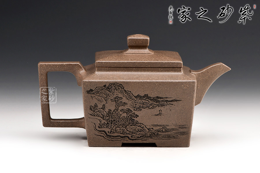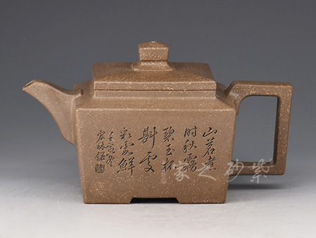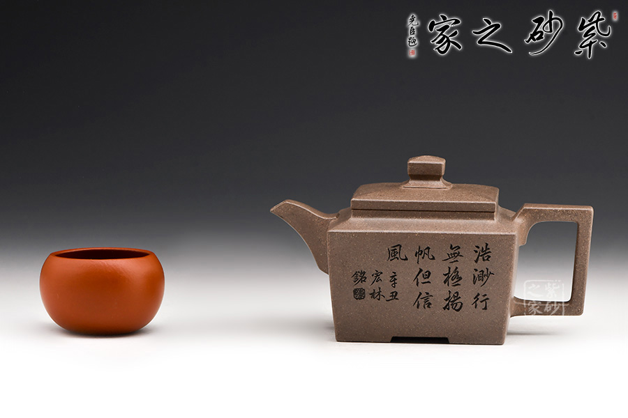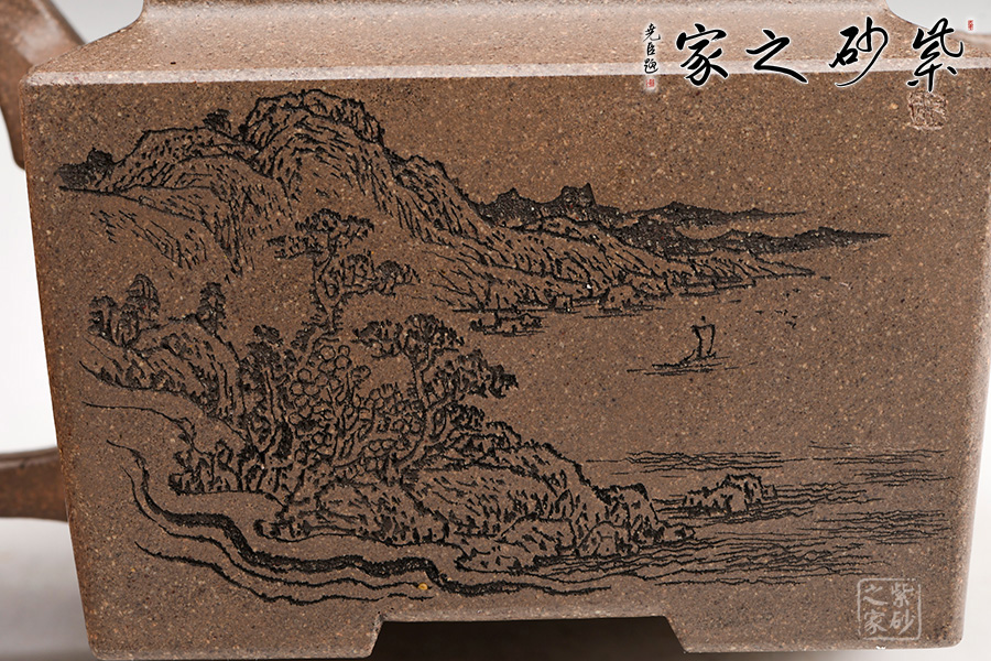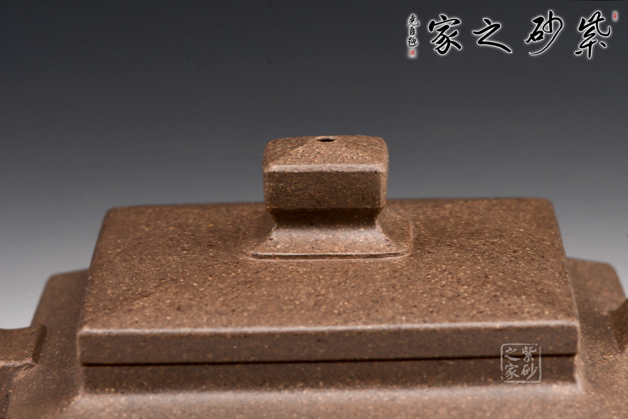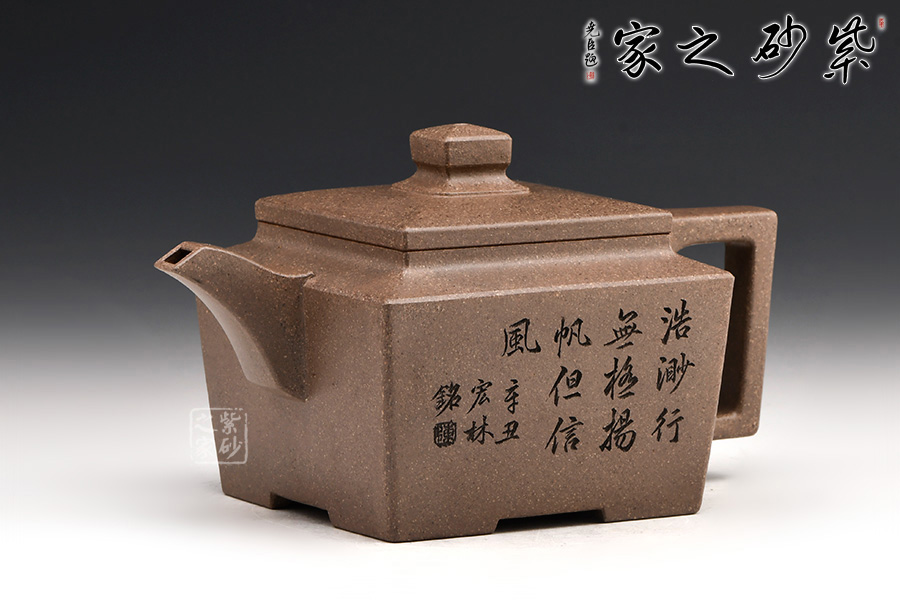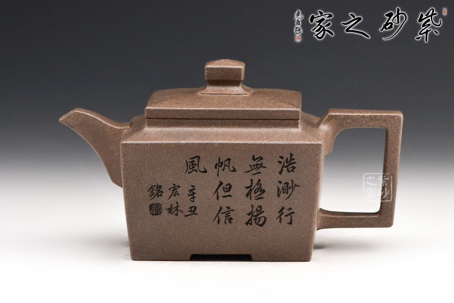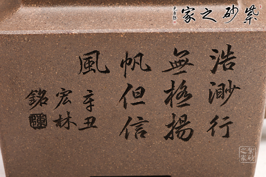 整壺方形隆起臺形蓋,鈕為四方,頂部開圓形氣孔。壺體表面顆粒細潤,紫褐而不姹。通觀此壺,有方正古雅、氣勢雄渾之非凡氣度。陳宏林老師刻繪價值加成,自不必說,值得賞藏。