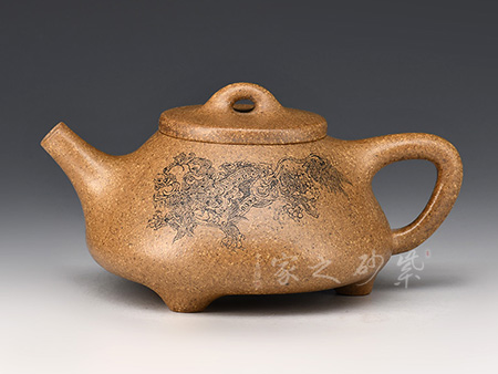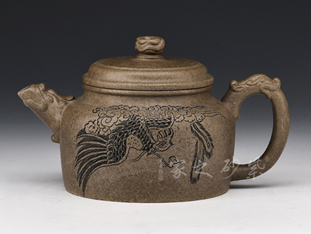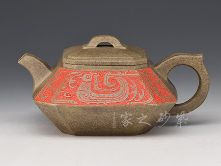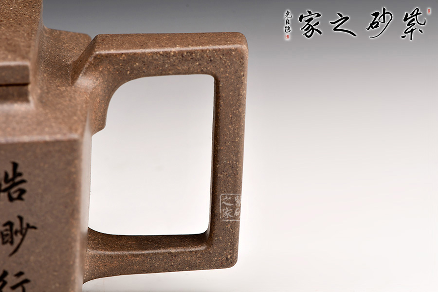 此壺以鑲接泥片之法精制而成。壺身為四方形,壺平肩微聳,向上蓄勢,圈鋬,方嘴彎流,壺口四方,底部犴門成四足式,折角內(nèi)隱的壺足托起整壺,使壺凌空,打破方斗的沉重感。