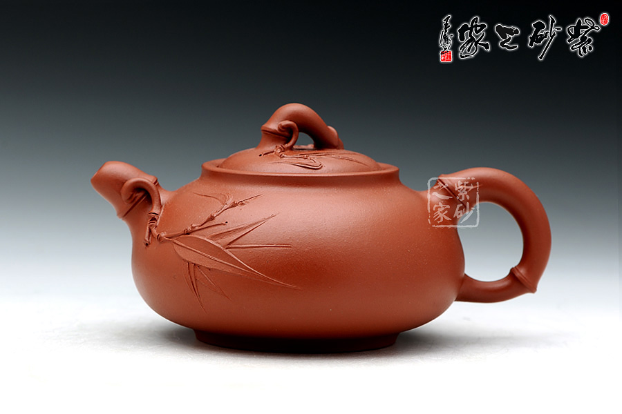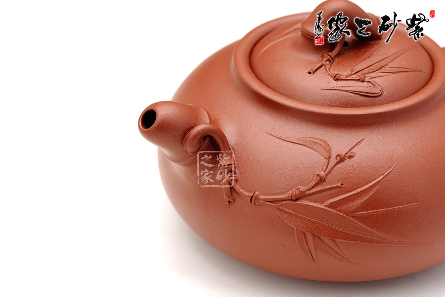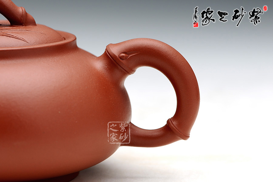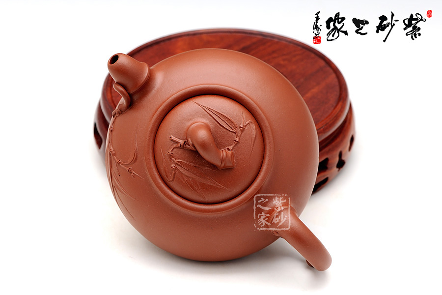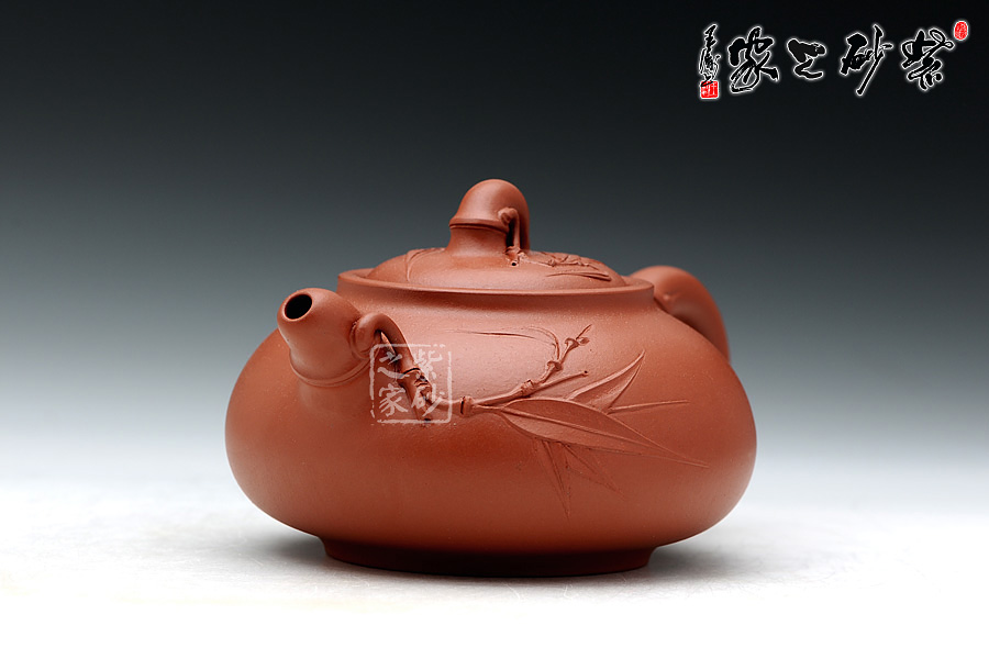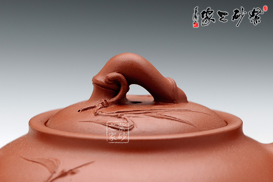 以四君子之一的竹子為主題,不但增加了文化意韻,而且有很高的觀賞價(jià)值,此壺采用貼花的手法將竹葉與壺嘴相連接,自然而逼真,各種竹子形態(tài)居于壺上,動(dòng)態(tài)十足,作者將文化藝術(shù)與紫砂藝術(shù)完美結(jié)合,可謂收藏使用皆相宜。