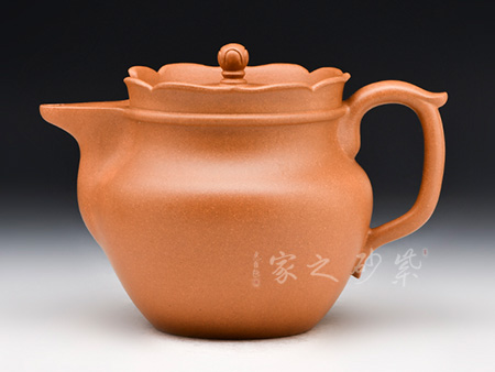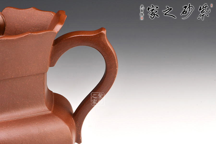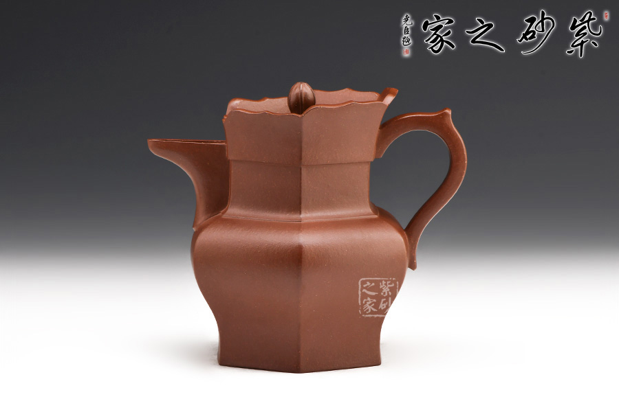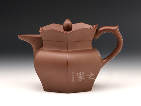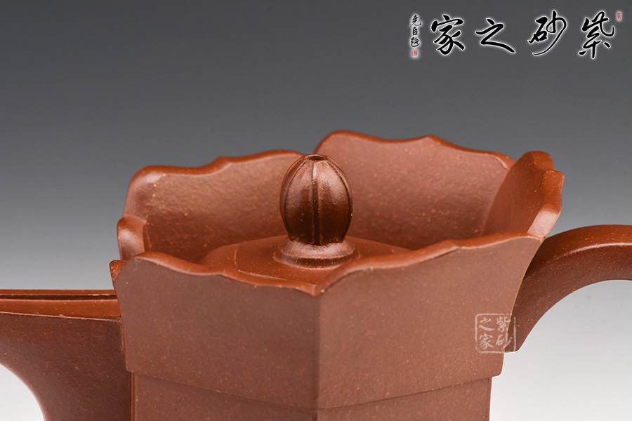 平帶形的把手與壺流相對,壺把的上彎處作一截飛龍,為按指位設(shè)計,便于拿取。與蓮花瓣相接處,壺冠口沿上翹,呈曲面托起六邊,在視覺上有很強的立體感與造型感。壺蓋呈正六邊形臥于口沿內(nèi),邊緣隱現(xiàn)在花瓣之中。蓋鈕樸拙雅致,宛若一顆花心,呈佛球狀,恰似僧帽之頂。