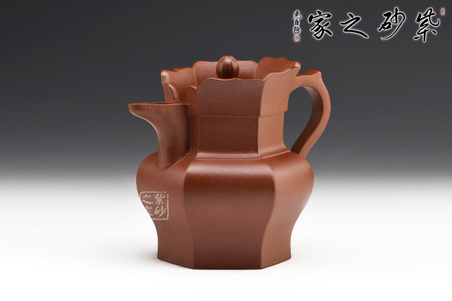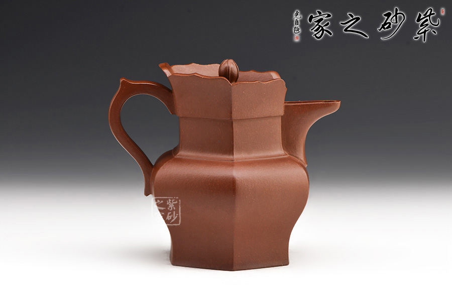 壺身為六角形的僧帽式樣,自壺蓋始,將整個壺體均分為六等分,形體敦實,氣韻飽滿溫厚,壺身上部,沿口長有六瓣蓮花,對稱均衡,線條此起彼伏,婉轉(zhuǎn)流暢。其中一瓣改為壺流,形與意都有引流循環(huán)之意。
