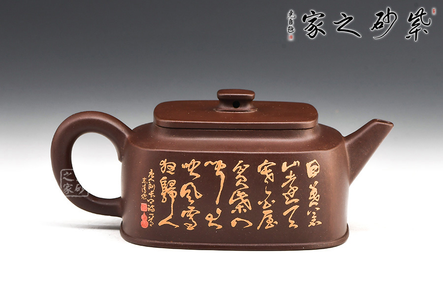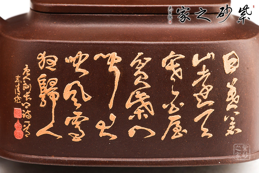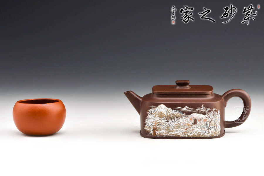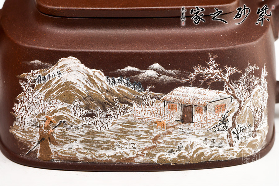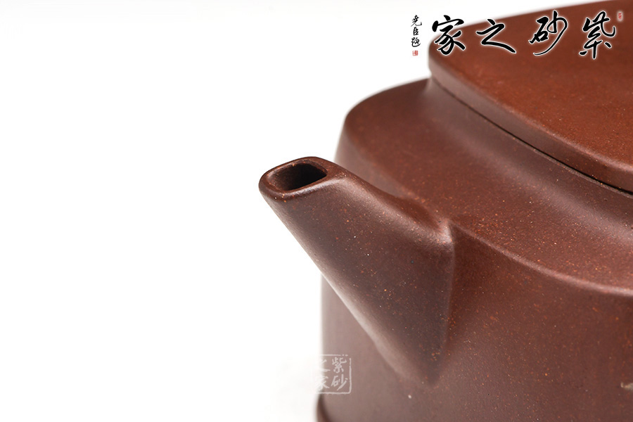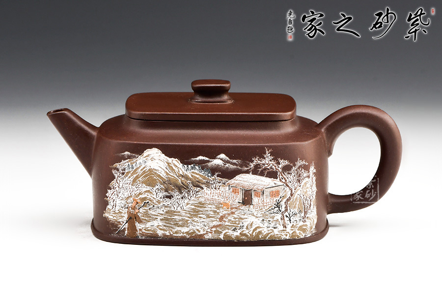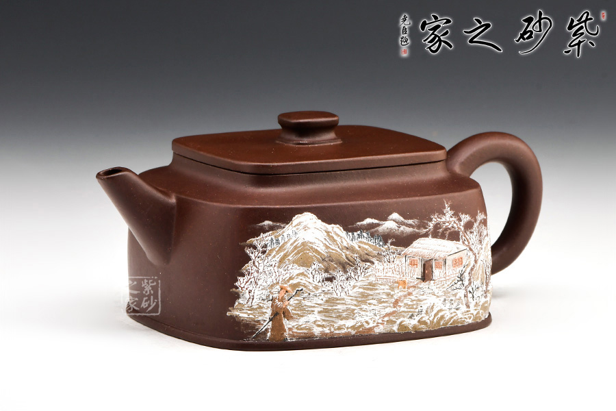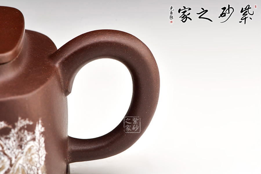 “泥繪第一人”張志清老師所制的四方臨泉紫砂壺,四方基底,下寬上窄,使此壺具備方壺穩(wěn)重剛強(qiáng)的優(yōu)點(diǎn)。寓圓于方,此壺又不流于呆板單調(diào)。壺鈕于壺身變化與虛實(shí)空間對(duì)應(yīng),變化出現(xiàn)剛?cè)嵯酀?jì)的美感,平整的小方蓋與大平底的輪廓線(xiàn)梯形變化,四方鈕,敦厚實(shí)在。劍流直嘴,出水利落,斷水干凈;傳統(tǒng)耳把。