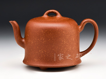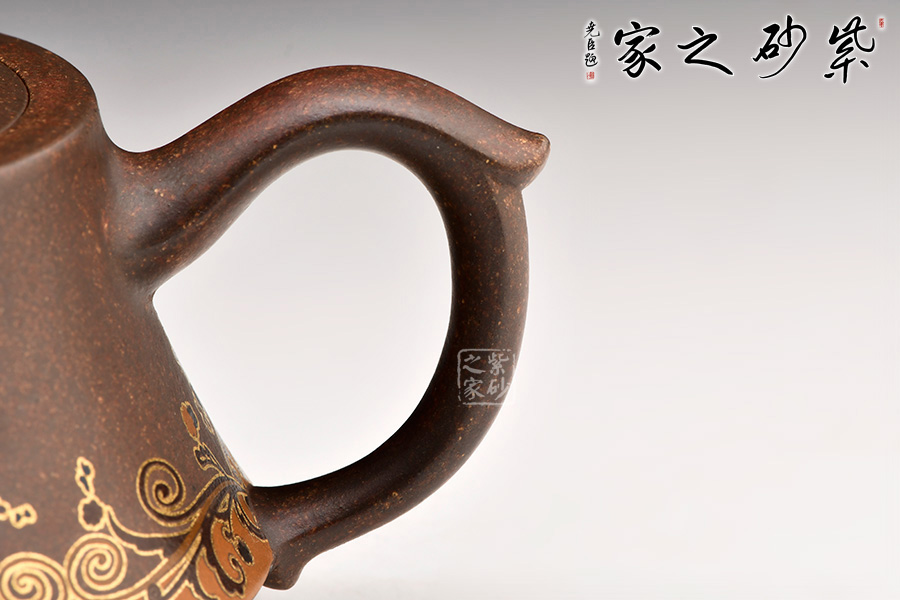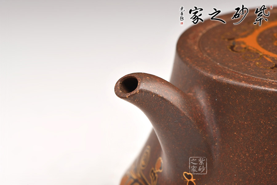 做工細(xì)致,色澤古雅,底蘊(yùn)十足。壺為柱形,上窄下寬,壺底如同一個(gè)盤子與壺身相接而成,壺身向內(nèi)凹陷,力蘊(yùn)十足。同時(shí),一變嘴扁平而修長,也是向內(nèi)凹陷,嘴口朝天,壺嘴上側(cè)為弧面,造型別致。而飛把呈倒耳形,拿捏方便。圓的子,嵌蓋,氣密性極好,歷久彌新,足見功力。
