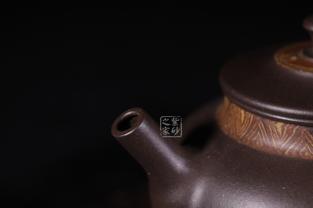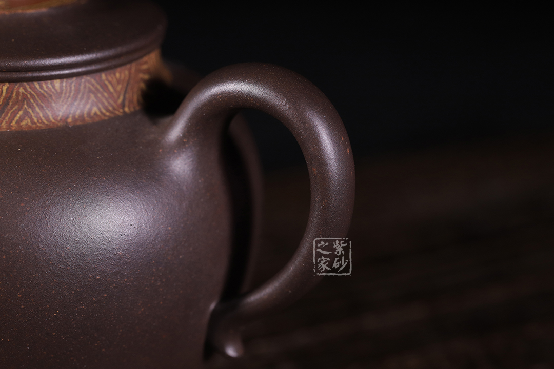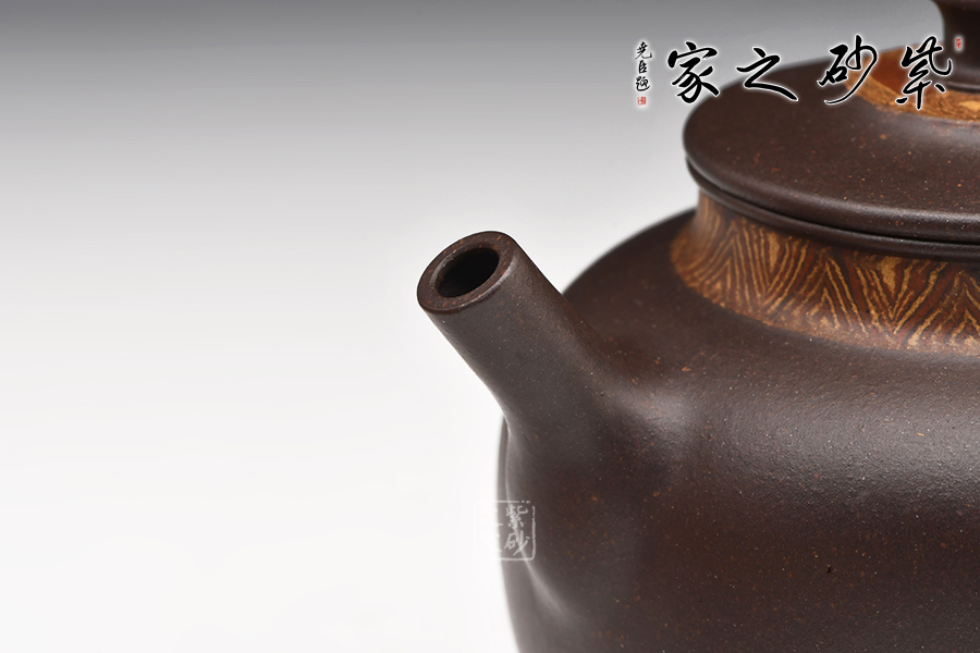 此件壺品造型別致,線條曲轉(zhuǎn),使得點(diǎn)面之間收放自如。壺身大度飽滿,延伸至肩頸收斂,子母線圓實(shí)使得平蓋內(nèi)嵌壺口,氣密性良好。絞泥工藝在壺口裝飾成三角花紋帶,使之更有古樸原始的陶罐韻味,起名陶韻十分貼切。