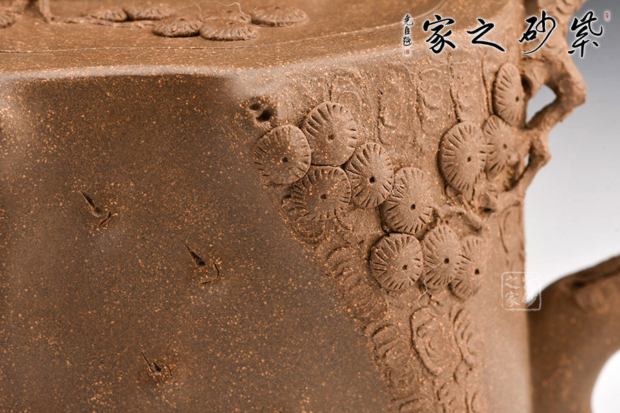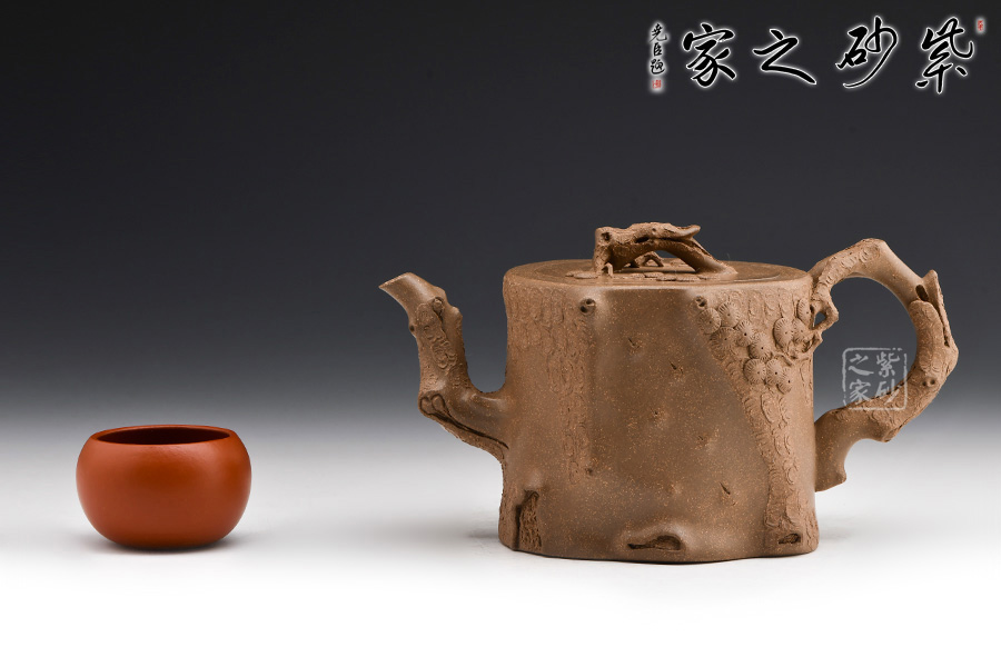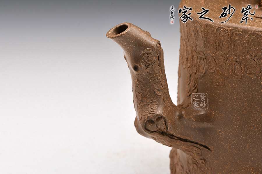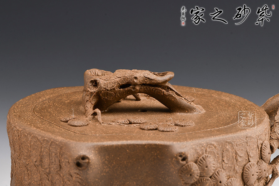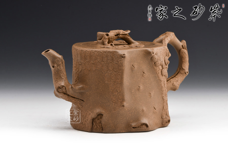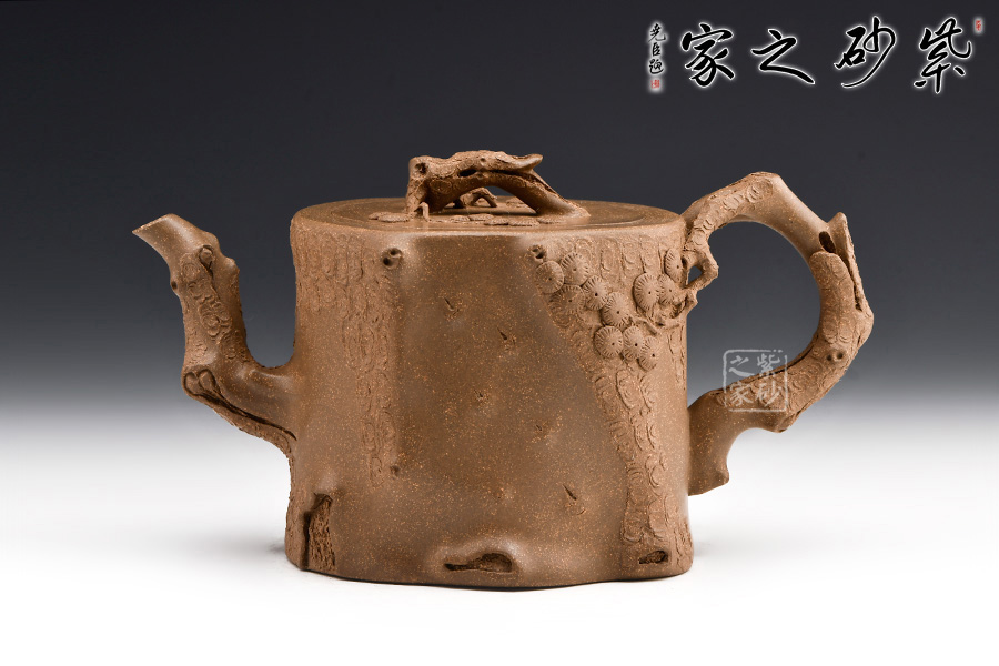 該壺造型為一截松段,通體作松樹樁形,表面斑駁嶙峋,樹皮縱橫,老味十足,逼真自如。壺流與把手以松樹枝巧塑而成,枝干、樹癭刻劃精細(xì)入微,自然生趣。