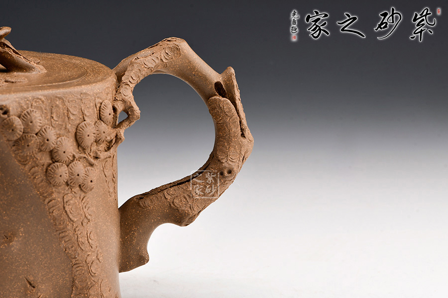 蓋以松樹枝作鈕,與壺腹渾然一體。青段作胎,色澤泥黃,質(zhì)堅(jiān)溫潤,與自然本真之色一致。