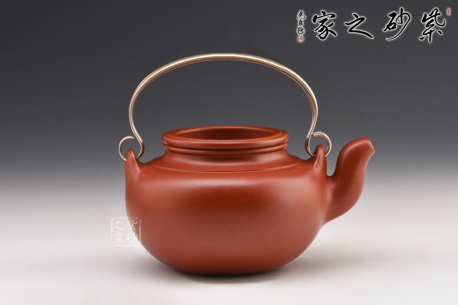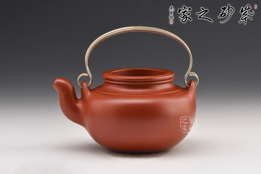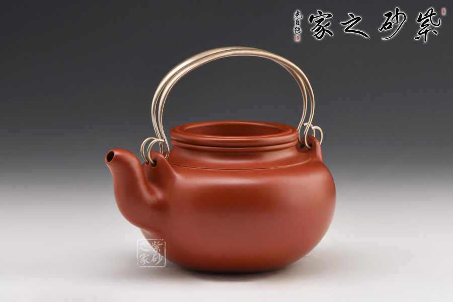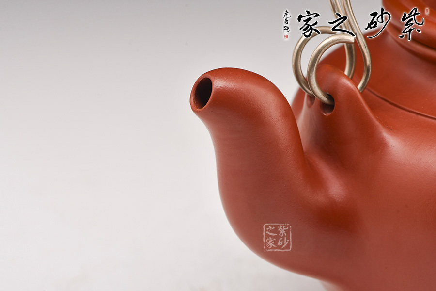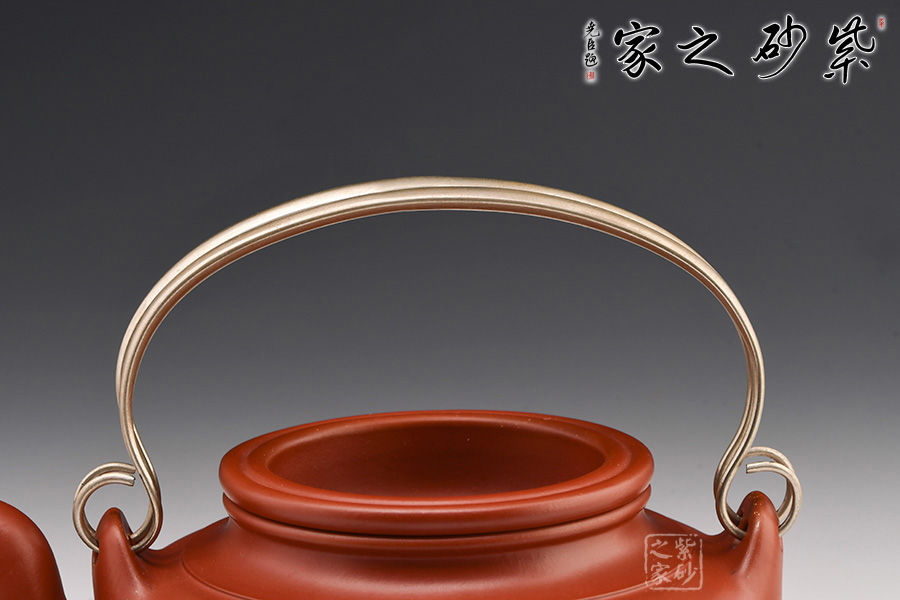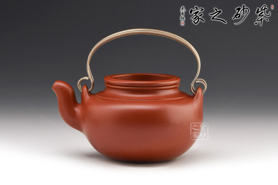 矮蛋包型,銅把提梁式,壺身圓曲豐滿,骨肉勻挺,口、流、蓋做工精致,流順自然,比例適度。
