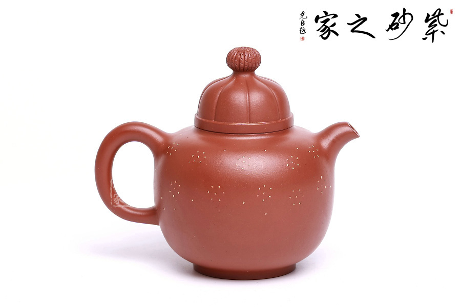 作者制壺工藝精湛,多有創(chuàng)新,極具個性風(fēng)格。這款憨童壺,圓壺形,形似一冬季著厚棉衣,戴厚棉帽的小童,形象別致,極具童趣。以帽為蓋,毛球為鈕,為作者奇思妙想之體現(xiàn)。短小的壺嘴,半圓形環(huán)把,與稚童短小、憨胖的形象和諧一致。壺底圈足作底,穩(wěn)重之中又別具一格!壺身鋪砂裝飾,猶如白雪落到稚童身上,玩樂嬉戲留下的印記,更顯自然生趣!