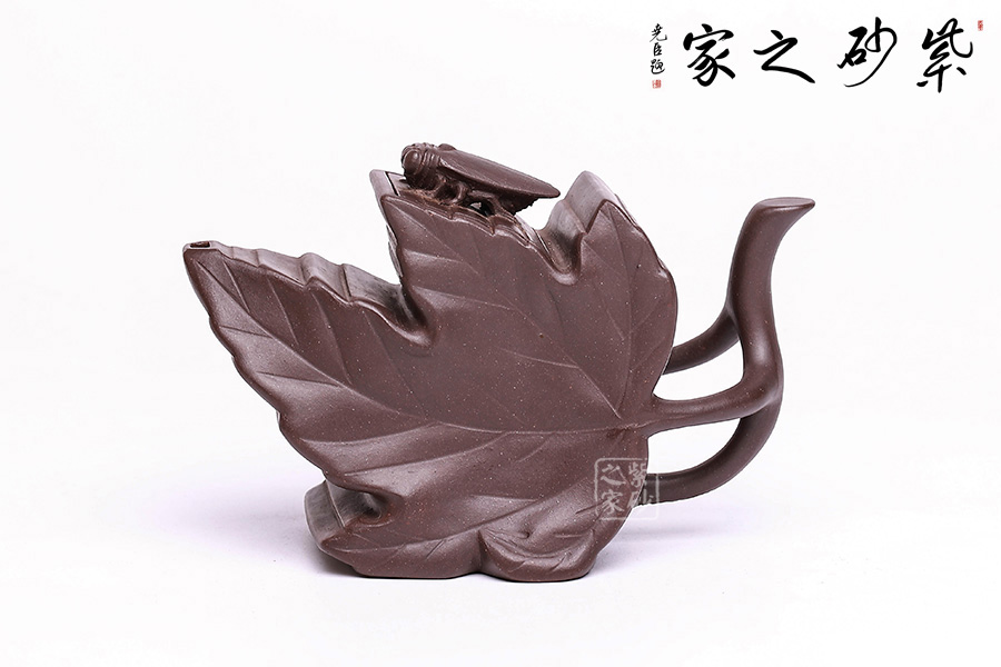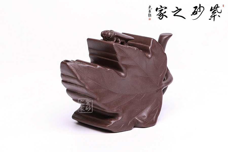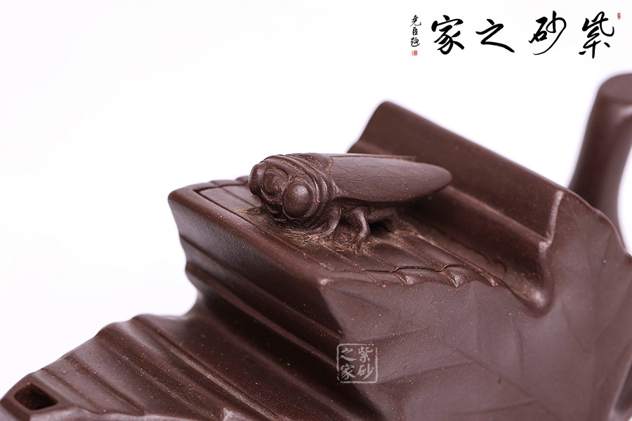 以梧桐葉片做壺體,那絲絲葉脈,被刻畫得栩栩如生,每一條樹葉的紋路都如天然雕飾。那卷曲的葉柄,恰巧作壺把,平添了幾分淡雅品位,這便是藝術(shù)品的獨特格調(diào)。為了使壺身保持穩(wěn)妥,倪順將樹葉微卷成足底,不僅解決了這個技術(shù)難題,更升華了夏樂之意境,風飛葉卷,別具情趣。梧桐葉上停息著一只鳴蟬,紫泥捏塑的蟬巧作壺鈕,惟妙惟肖,猶如一只真蟬眷戀著夏日里這片梧桐葉,歡快的吟唱著內(nèi)心的喜悅,作品真正到達了“此時無聲勝有聲”的境界。