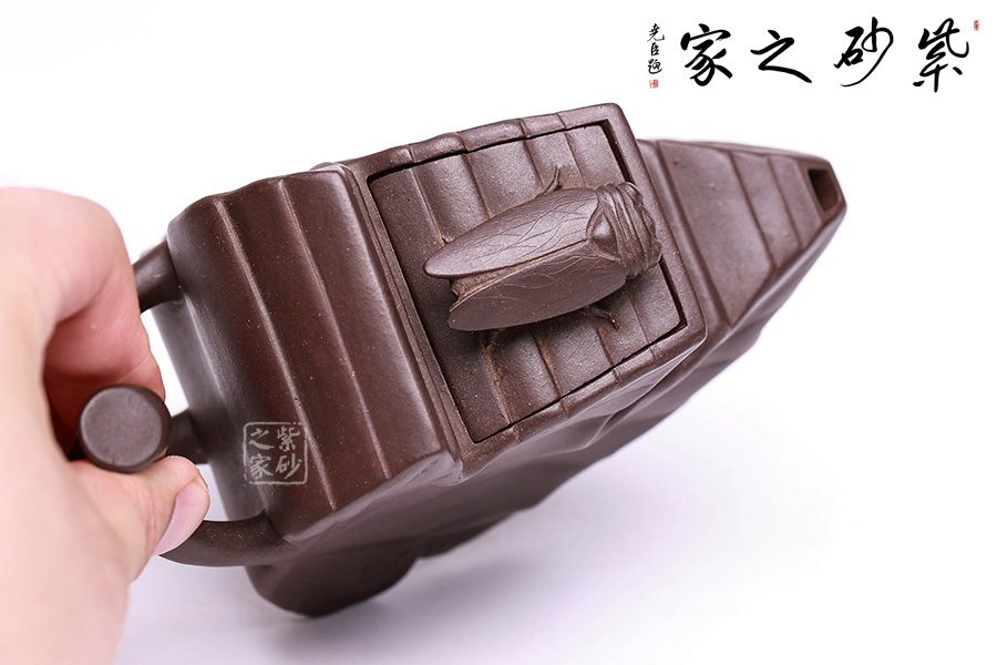 一片綠葉風中舞,鳴蟬吟唱如歌謠。原款由珍貴墨綠泥制作的堪稱花貨經(jīng)典的夏樂壺,為我們營造了一幅別開生面的盛夏場景,實乃壺器巨獻。此款原礦紫泥制作的夏樂壺同樣魅力非凡。