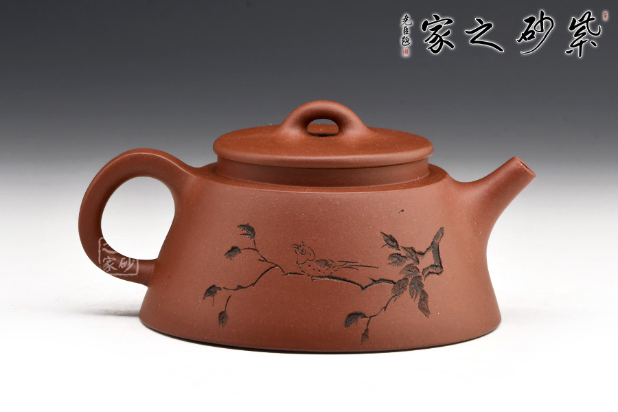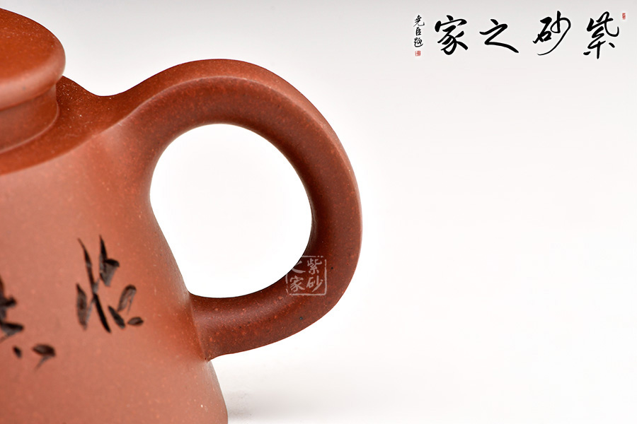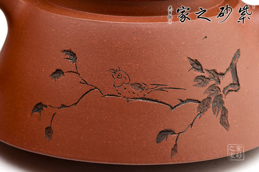 此壺身為倒扣的“碗形”,形成一張網(wǎng)的效果,是一款意形出于體的作品,魚罩壺形出捕魚的罩。此種造型放置更穩(wěn)當(dāng)。整個(gè)壺個(gè)性十足,意韻悠長(zhǎng),讓人不禁仔細(xì)揣摩?!扳蛔缘谩彼淖峙渖蠘渖蠚g快的百靈鳥,愜意不已。