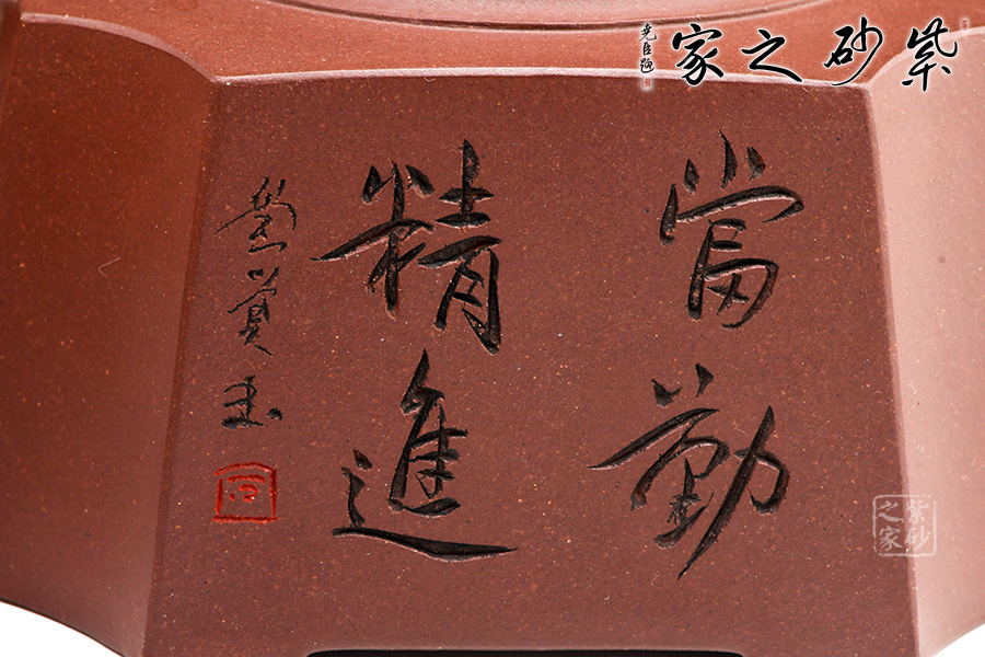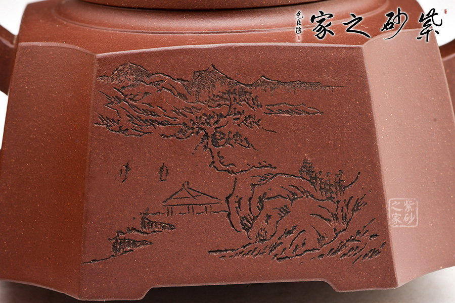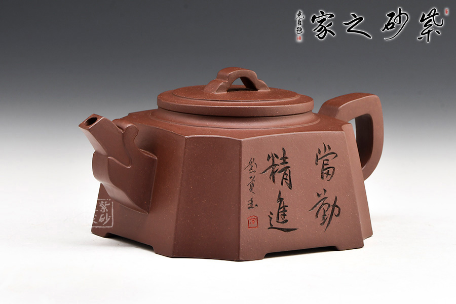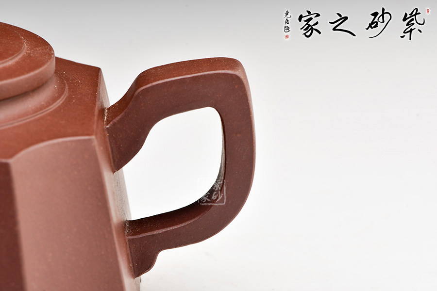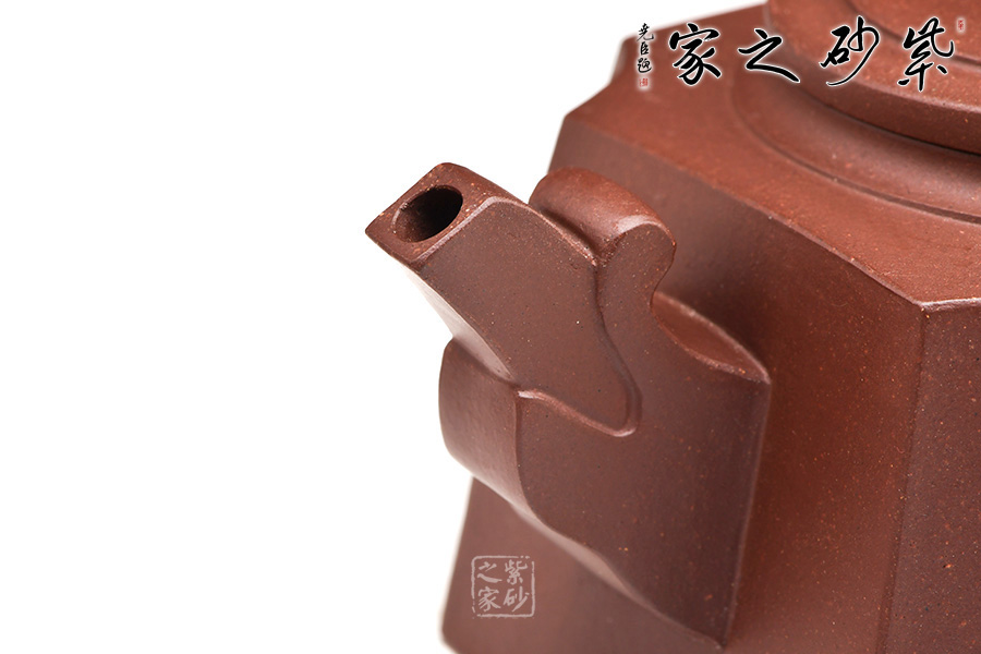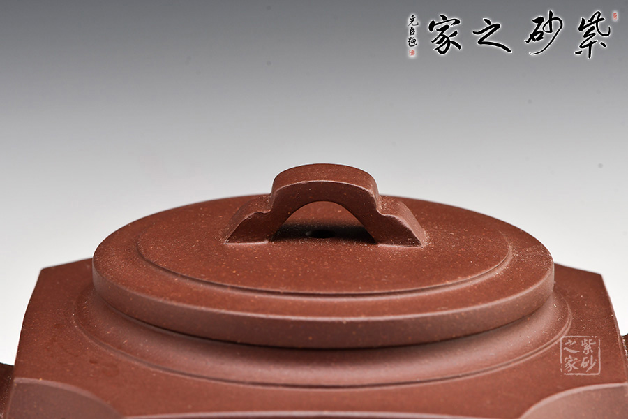 此款在四方壺造型上做了圓蓋的設(shè)計(jì),又將四角加入圓弧設(shè)計(jì),增加了器型的張力。雖說四方實(shí)則八面,又非正八面,有方中窺圓的精巧構(gòu)思。壺嘴水花形狀,似抽象的象征長壽的神龜,壺鈕有龜背花紋之感,整個(gè)壺呈現(xiàn)端莊穩(wěn)重的大將之風(fēng)。