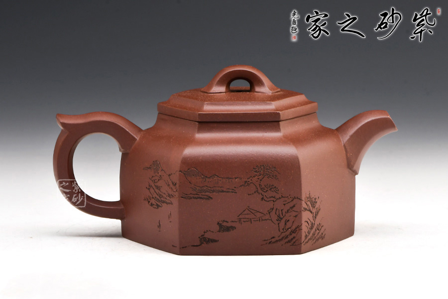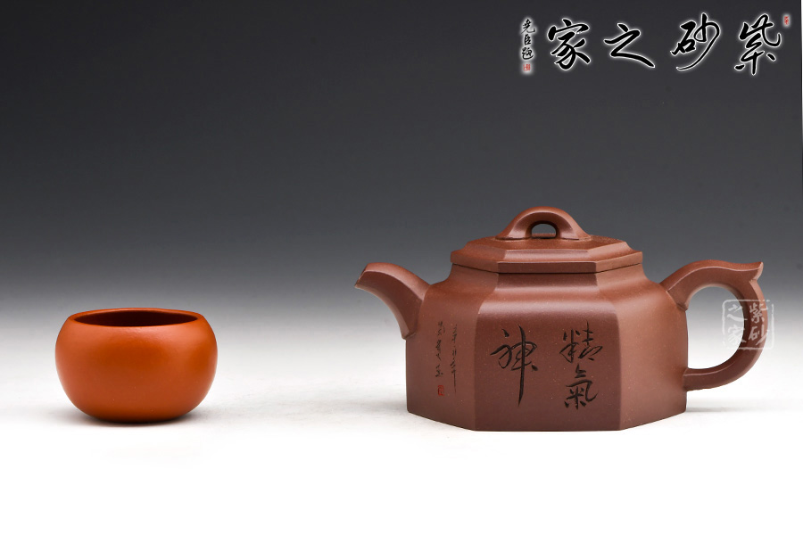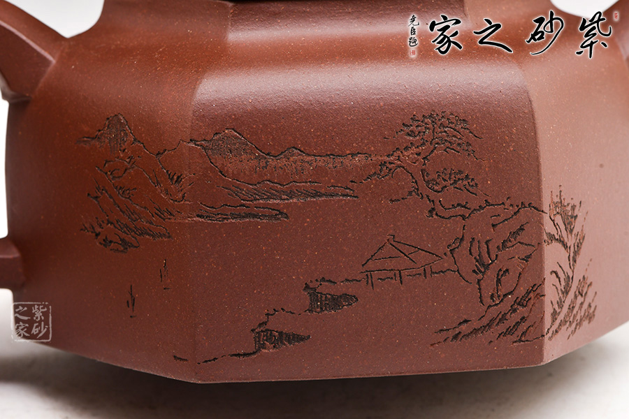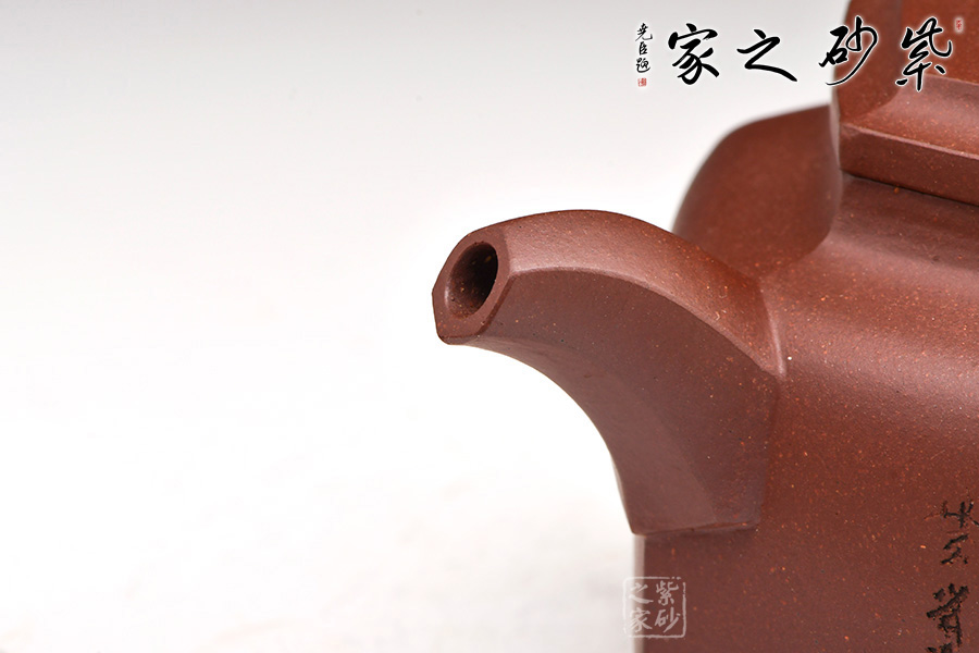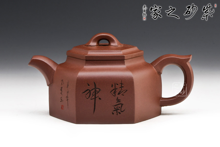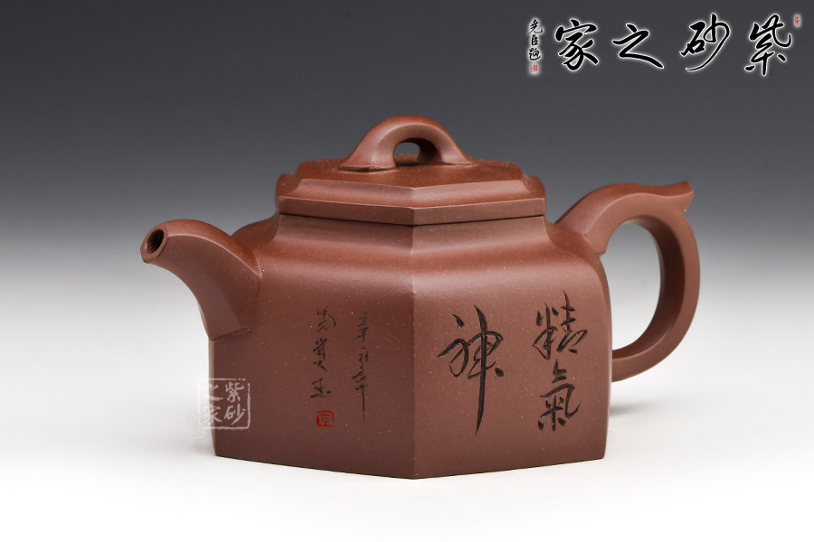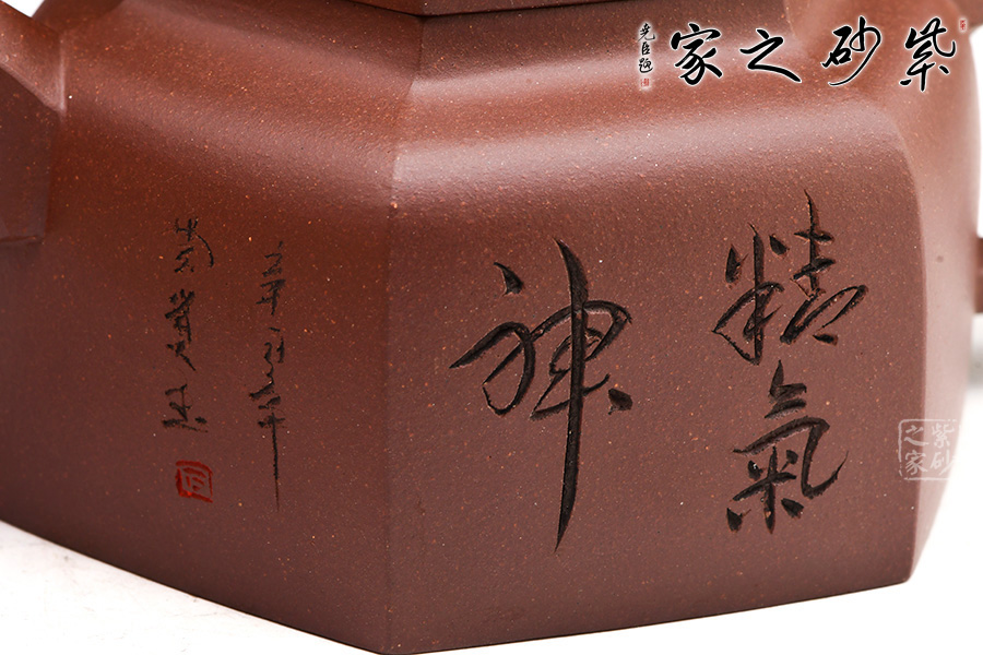 此作為六方,六這個數(shù)字,在中國寓意著事事順利,萬事如意。此壺刻繪“精氣神”三字,干凈利落,且壺形端莊特別,挺秀大方,在制作工藝上無疑是一款成功的方器造型作品。