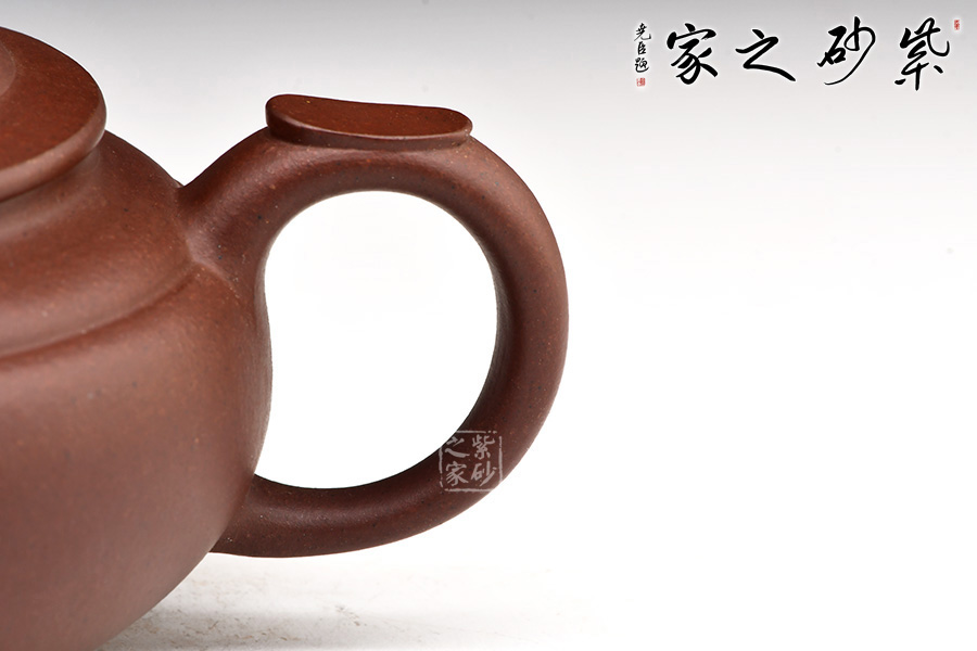 此壺造型端莊、秀美、新穎脫俗,在柄的環(huán)狀之上稍加改動即可安放拇指,又與壺蓋鈕相呼應,真可謂匠心獨運、設計巧妙。