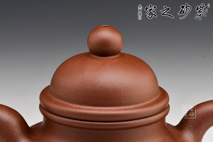 壺蓋呈飽滿的半球狀,壺鈕圓珠鑲嵌,張力十足。