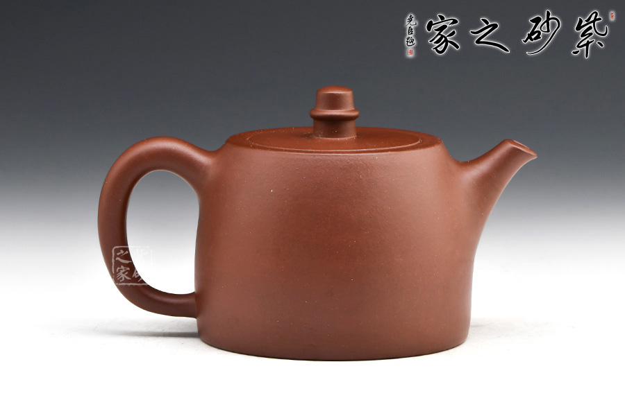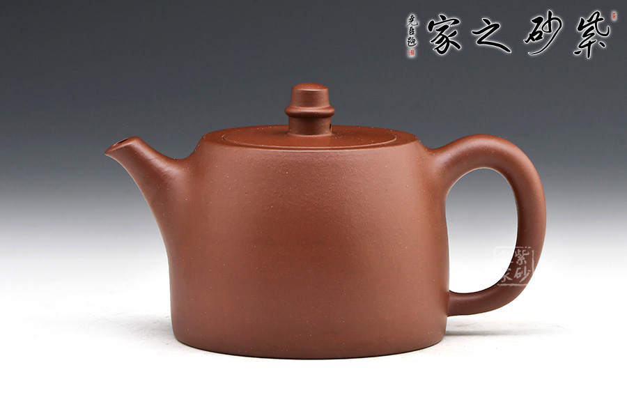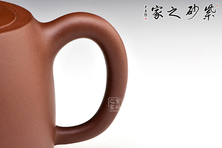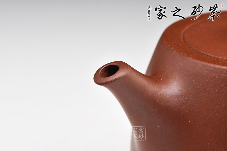此壺壺身由弧線構(gòu)成柱體,壺鈕亦之,光滑細(xì)膩;管狀流斜斜向上,略微呈魚嘴;環(huán)形壺把隨身勢(shì)出,端持穩(wěn)重;嵌蓋嚴(yán)絲合縫,倒茶不溢出。