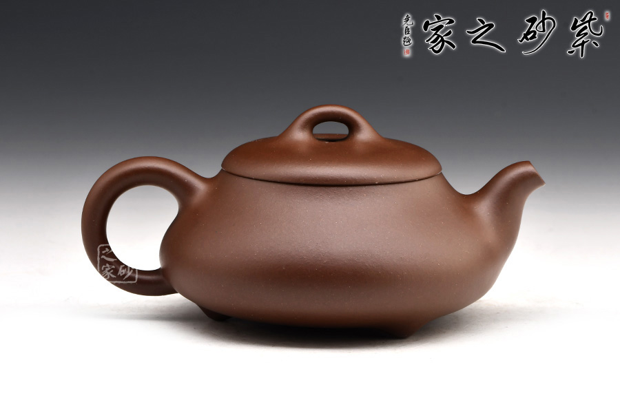 壺體扁圓,壺腹上小下飽,斜面過渡自然,分寸不易掌握。三足撐開穩(wěn)實有力,蓋上拱橋狀壺鈕頗為小巧。壺身一彎和圈把處在同一直線上,對稱有致。