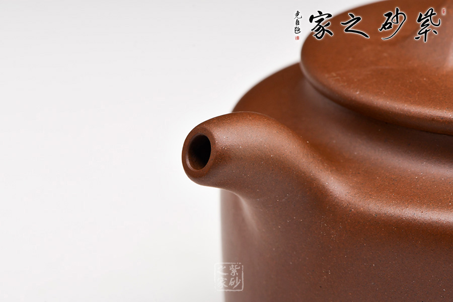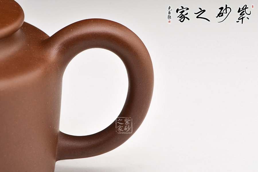 壺身圓滑,直而不癟,壺肩線條圓轉(zhuǎn),過度極其流暢。鋬流根部與肩線自然結(jié)合,各自延伸化轉(zhuǎn),呈疏朗大氣之韻。壺把舒曲自然,壺嘴彎而圓,處理干凈利落。