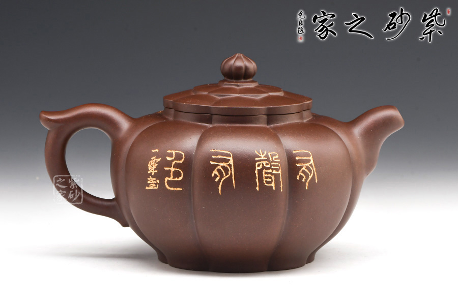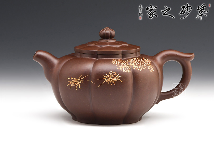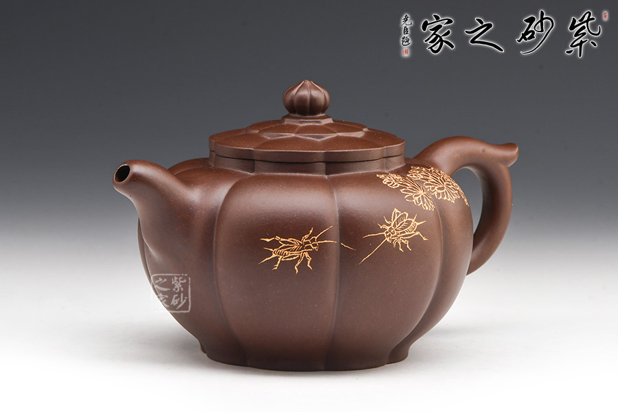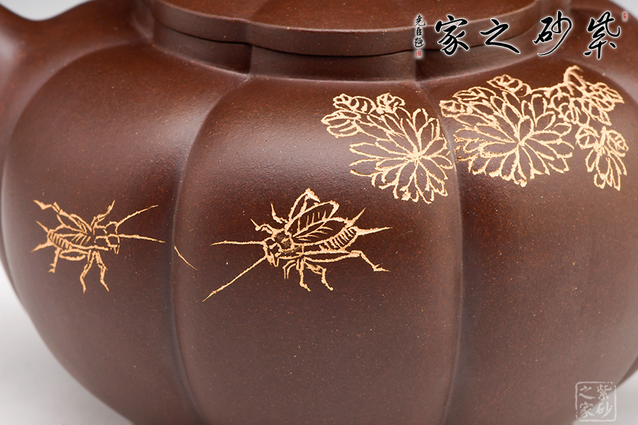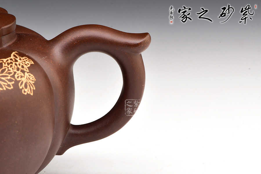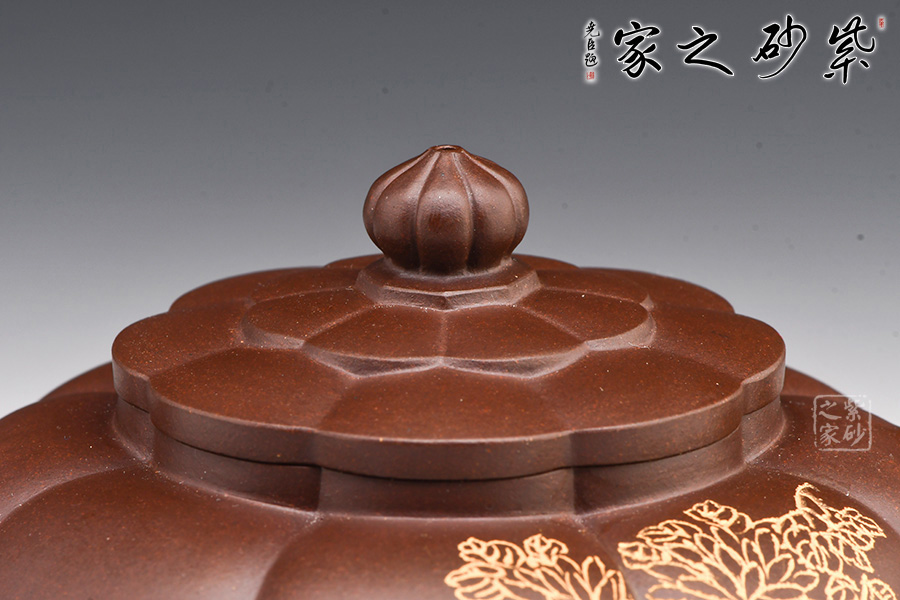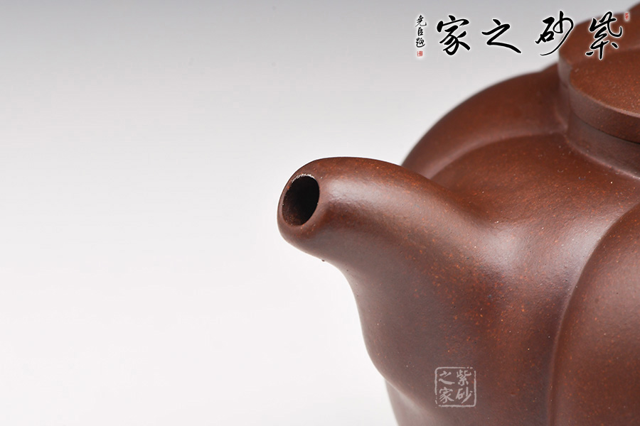 壺身圓潤(rùn)挺拔,筋囊鑲接成壺體,紋路清晰流暢;口蓋吻合嚴(yán)密,壺蓋與壺口設(shè)計(jì)成回環(huán)往復(fù)的藝術(shù)效果,給人以美的視覺(jué)享受;壺蓋上堆塑一圈“花瓣”,紋路與壺身筋紋相錯(cuò),恰處在正中間,更顯精致;壺鈕似蓮花還未綻放,觀(guān)感上佳,實(shí)用性強(qiáng)。小巧的一彎嘴,耳型把帶飛貼,拿捏方便。
