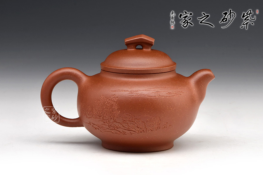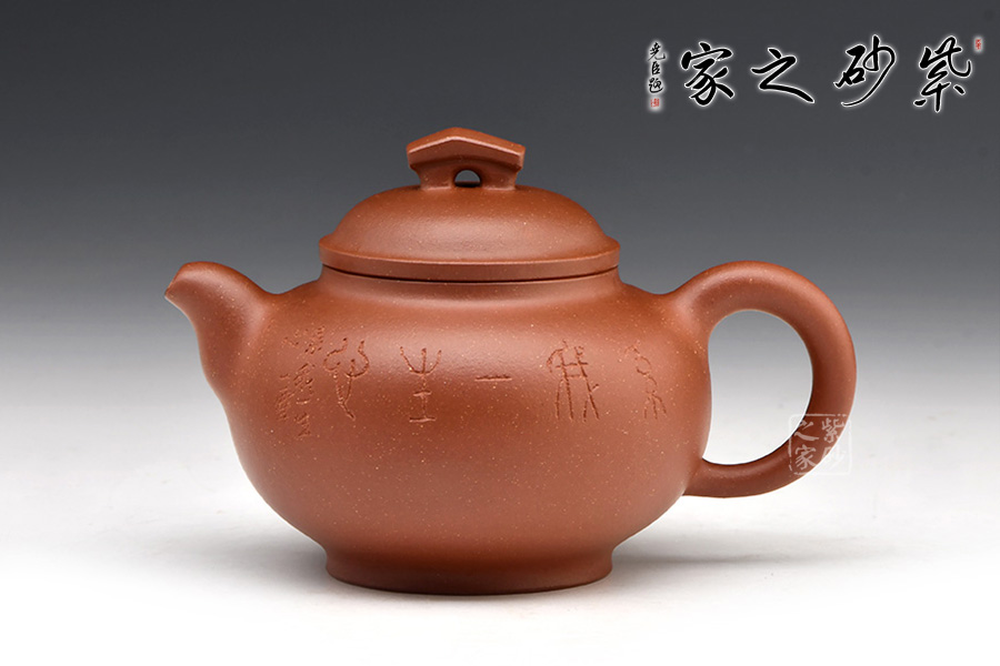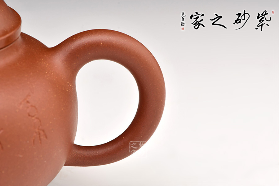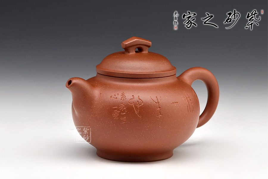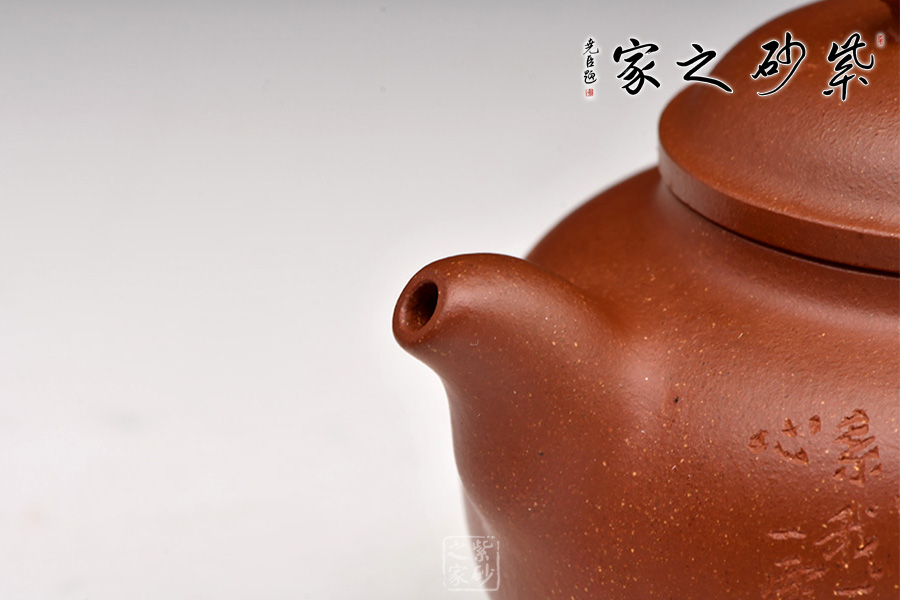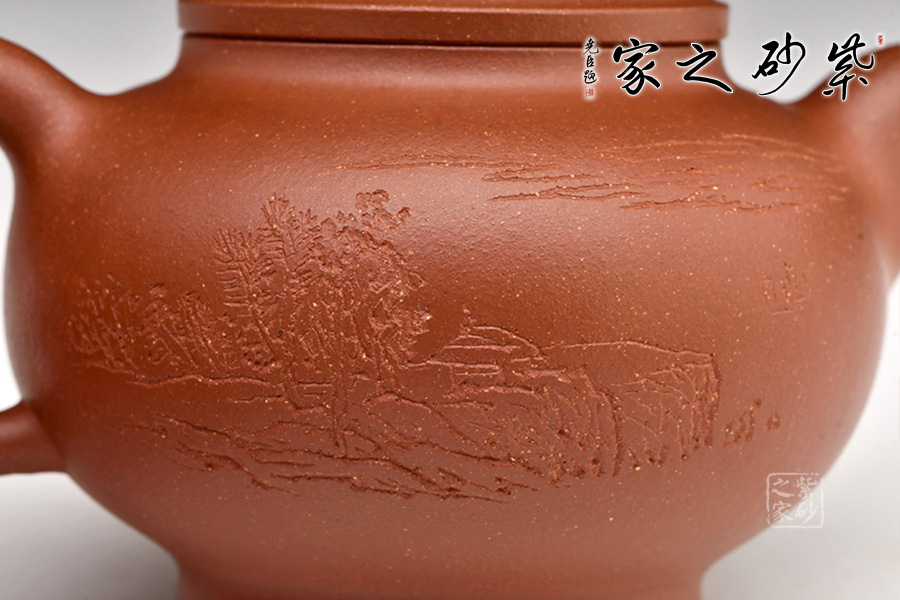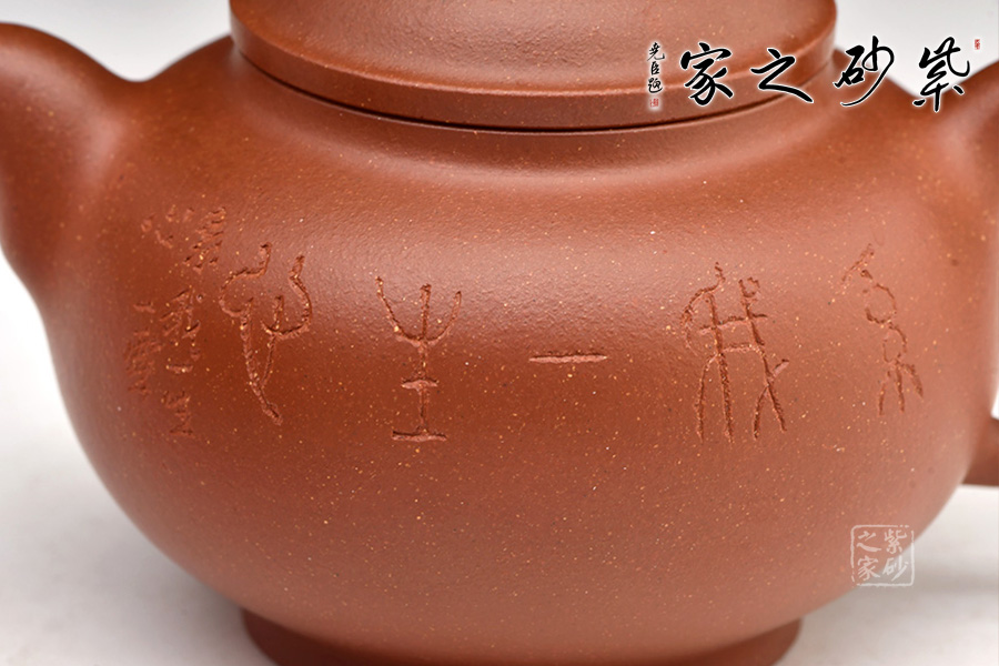 此壺周身圓潤,渾然天成,彎流嘴胥出,出水便利;耳形把圓潤,拿捏適手;壺蓋為壓蓋設(shè)計(jì),從四周向中部隆起,上置橋形鈕,惟妙惟肖;壺身刻繪有文字和圖案,雙面刻繪,刀法利落,是不可多得的精品之作。