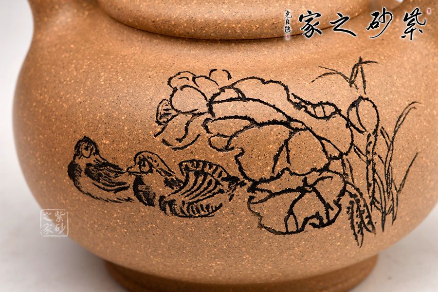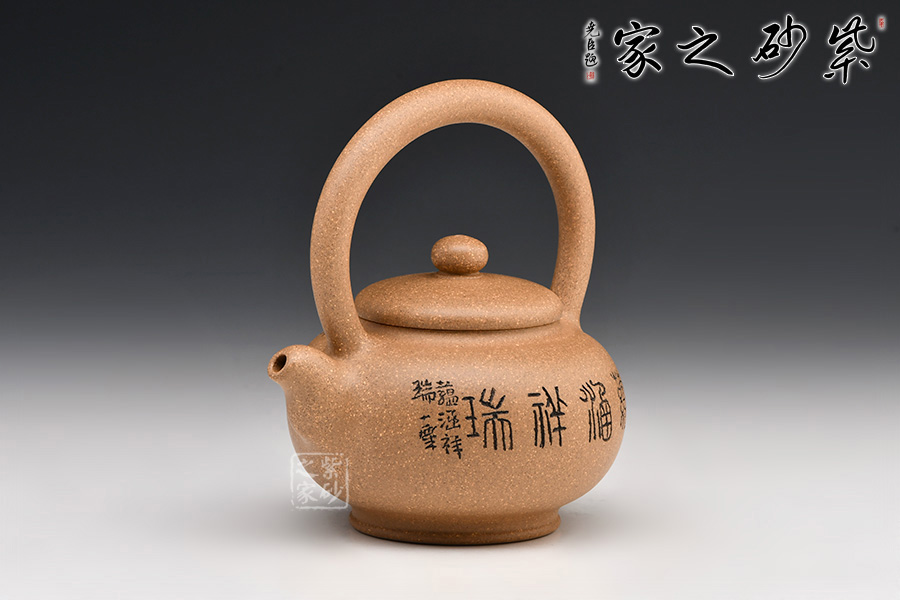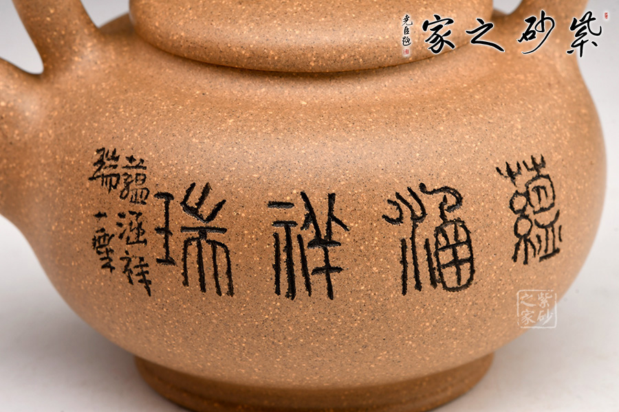 此壺端莊古樸,做工精美,著實(shí)是難得的佳作。于傳統(tǒng)之中有創(chuàng)新,提梁近似大半正圓,壺身渾圓,線條飽滿豐盈,壺底加圈足,與壺頸上下對應(yīng)。子母蓋對仗平整,鼓蓋略平滑,圓珠壺鈕小巧而精致。壺身篆刻有古韻,不刻意、不張揚(yáng),延續(xù)毛國強(qiáng)大師的拙中藏巧的厚味,雄渾恢宏,淋漓外露,磅礴和靈動(dòng)之氣全然于一壺。