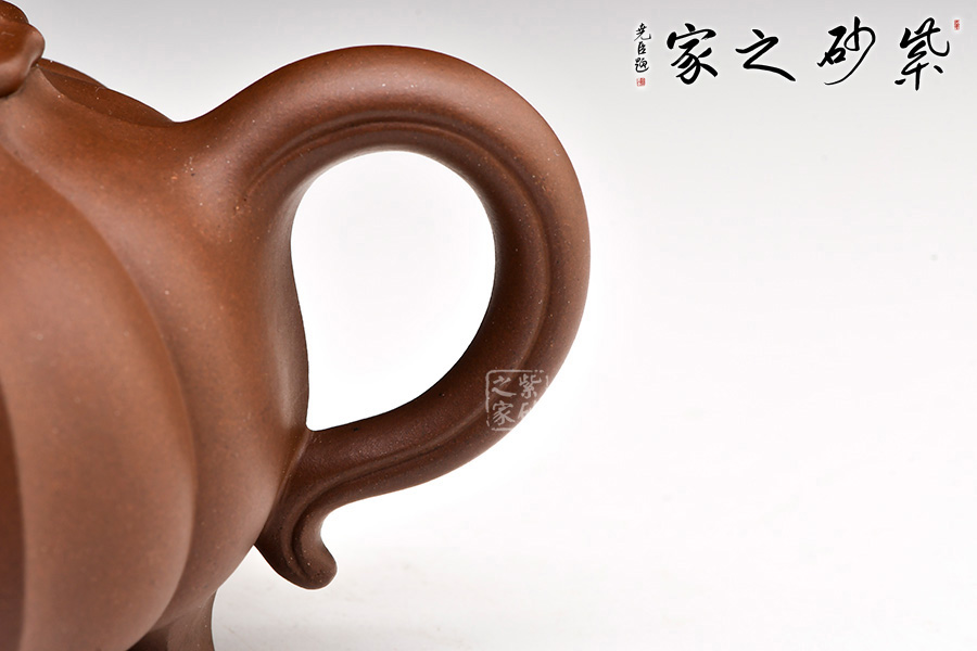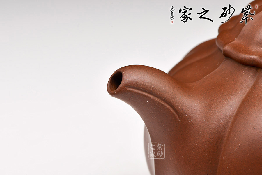 云爐壺敦厚周正,壺身筋紋線條凸凹有致,深淺如一,勻稱得體;下有三乳足,呈鼎力之勢(shì),使得整個(gè)壺型穩(wěn)重。矮頸,口、蓋筋紋密合度極佳,嚴(yán)絲無(wú)縫;大圓垂耳與一彎流相互呼應(yīng)。鈕取含苞的花朵為形,美觀的同時(shí)便于拿捏。