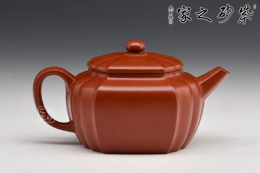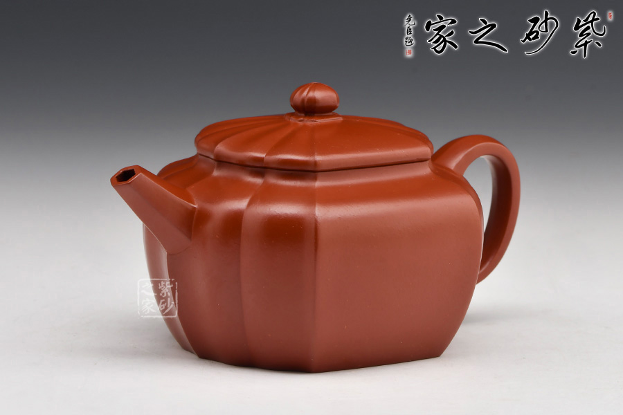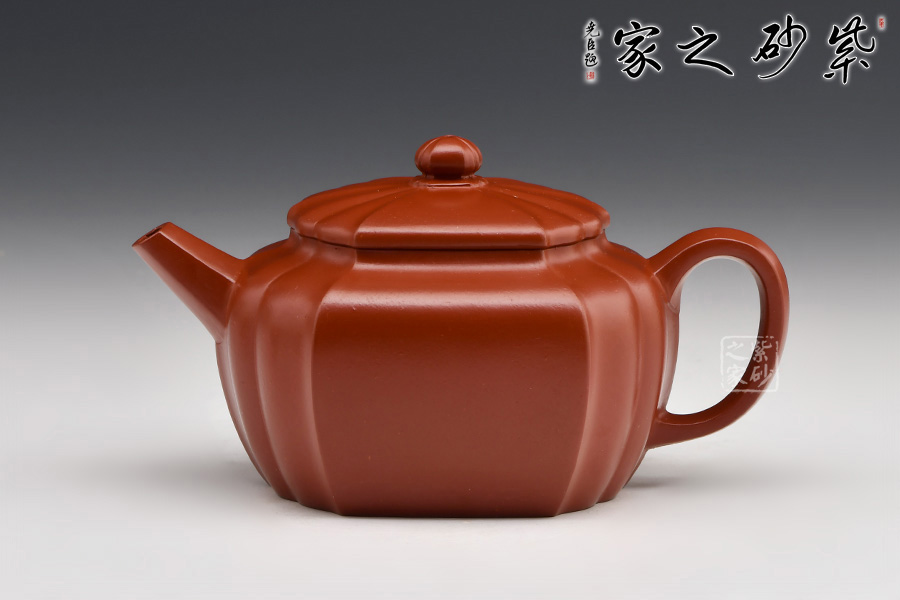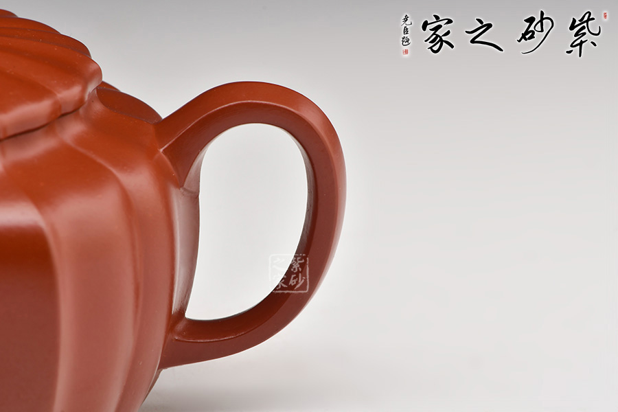 此壺造型古雅,為大紅袍筋紋器加四方造型,難度非常之大。整個(gè)壺筋紋明理清晰,明暗有度,而且比例協(xié)調(diào)。身壺由深淺不一的筋紋布列,呈方形狀,兩兩對應(yīng)。一彎嘴胥出有力,耳把線條流暢,各自收放自如,手法細(xì)膩。整壺具有陽剛又不失柔美,品賞把玩皆佳。