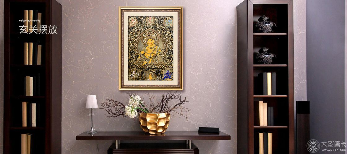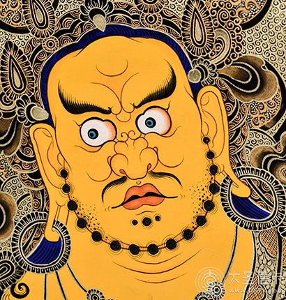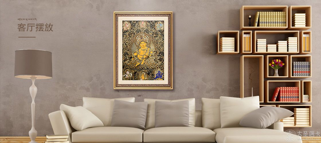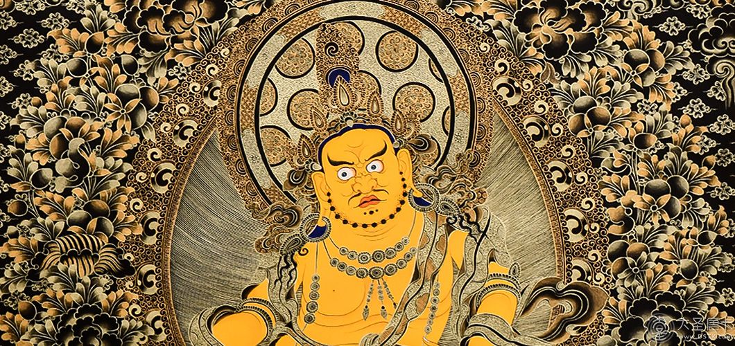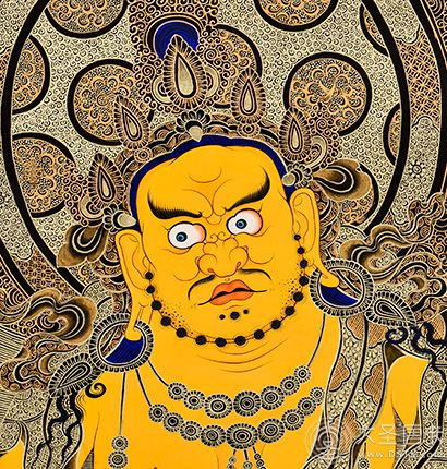 產地:熱貢 工藝:黑金 創作年份:2020 題材:黃財神 繪制時間:6月 尺寸:*70*100cm 裝裱: 材質:織面 使用場地:走廊