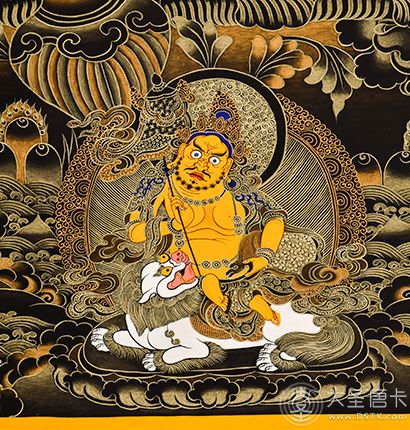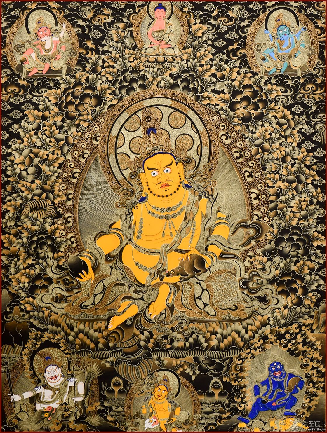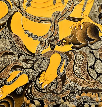 黃財神,是密教之護法神祇,諸財神之首,黃財神為藏地各大教派奉持的五色財神之一,右手持摩尼寶,象征寶光普照十方,增添眾生的福報;左手抱一只吐寶鼠,鼬的嘴里含著珠寶,象征財寶。右腳踏一只白色海螺,象征著他能入海取寶。