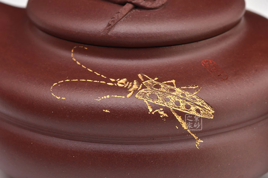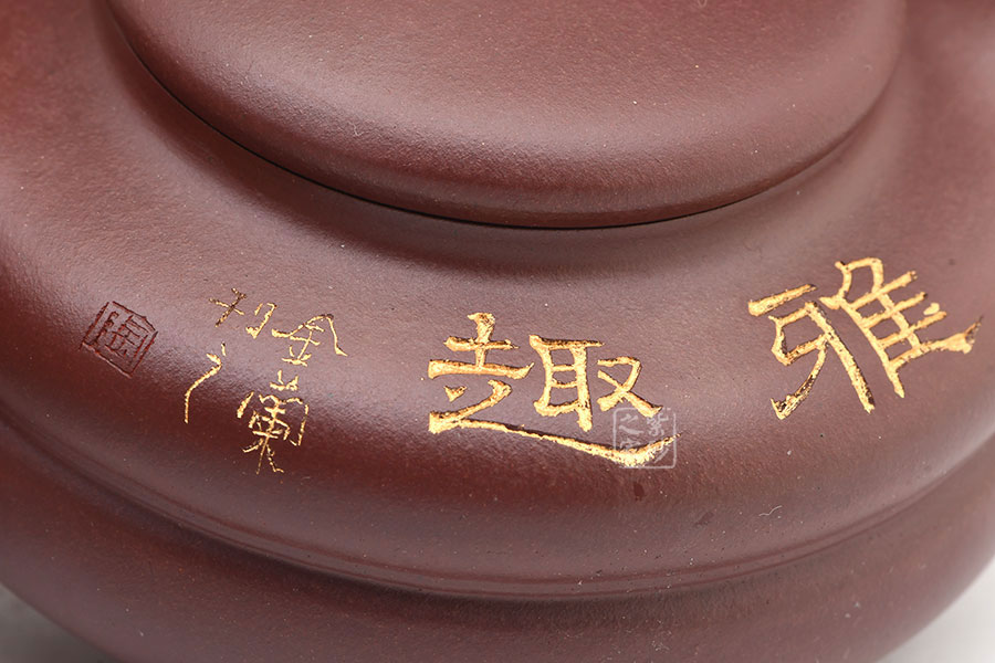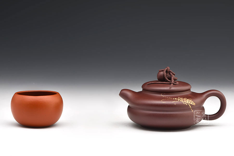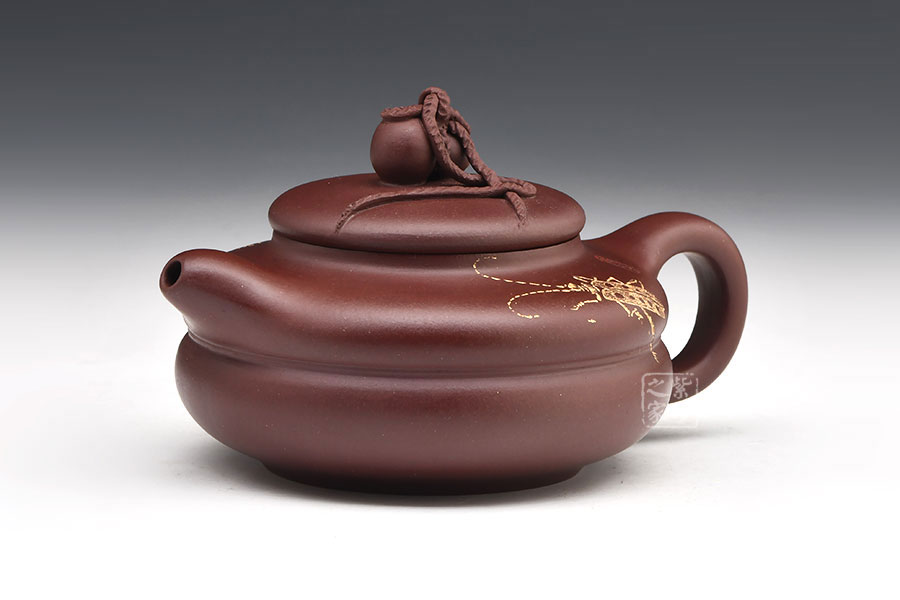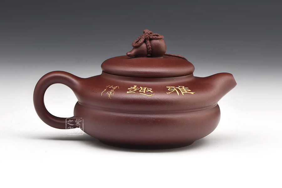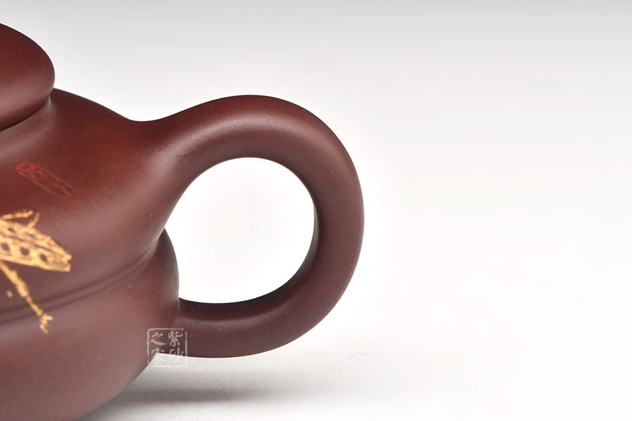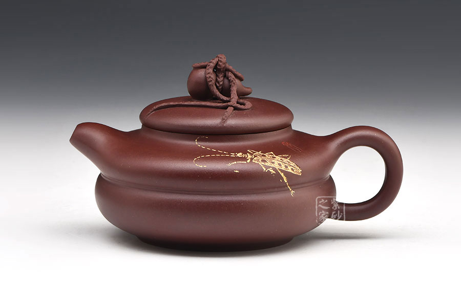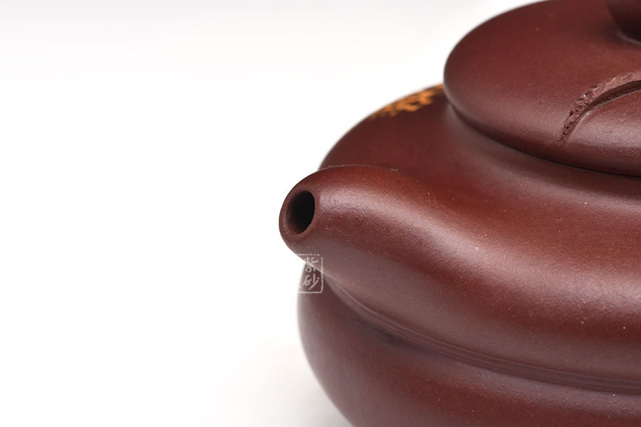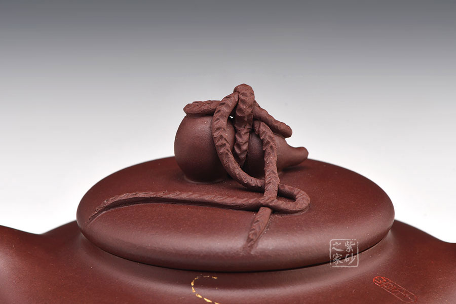 壺身中間一條橫紋把壺分為兩半,于是上下相對(duì),就成了一個(gè)壓扁的葫蘆。壺嘴短小精煉,與壺身融為一體,恰似一個(gè)葫蘆的開(kāi)口。壺把彎成一環(huán),不作修飾,正是又一個(gè)葫蘆。壺蓋上以葫蘆作鈕,葫蘆上還捆著一根仙繩,充滿生活逸趣。