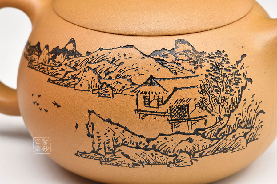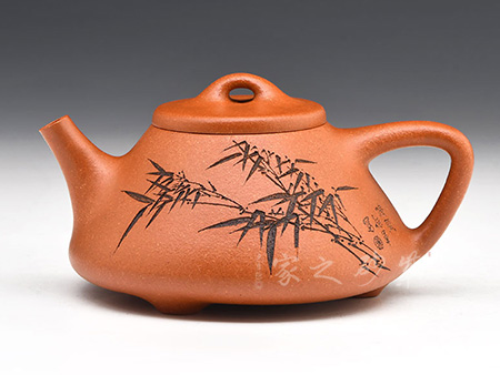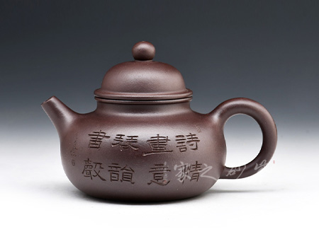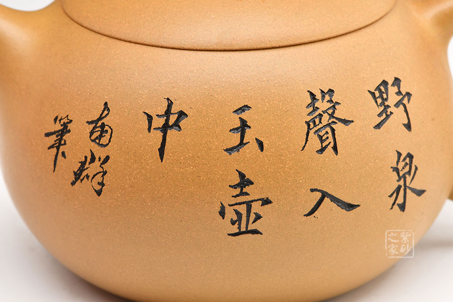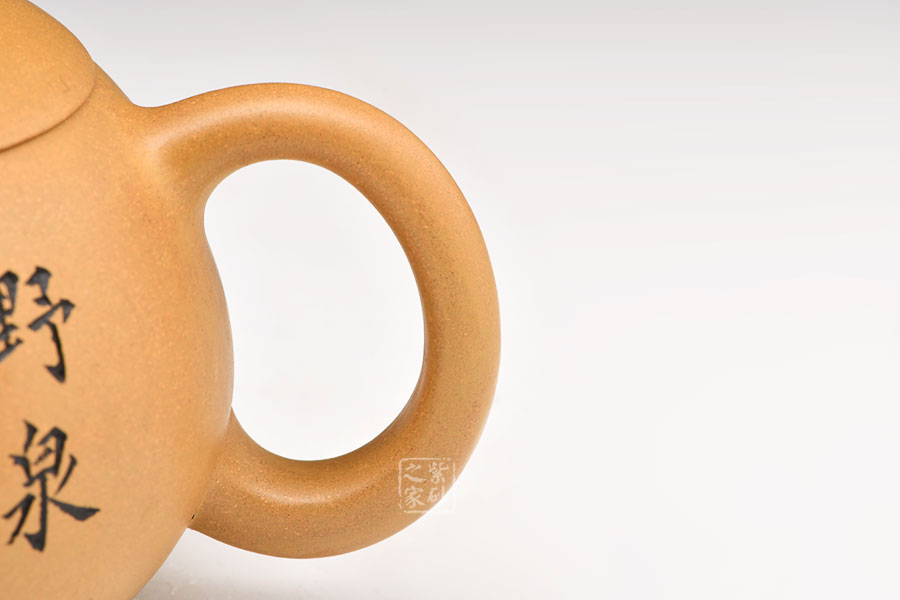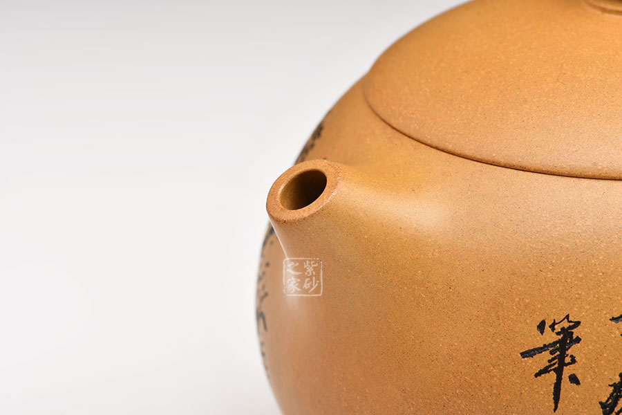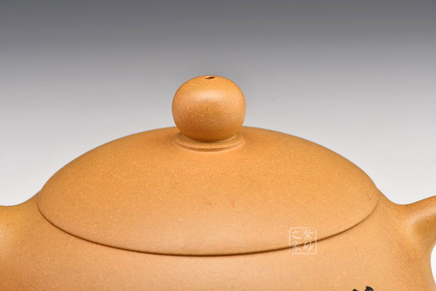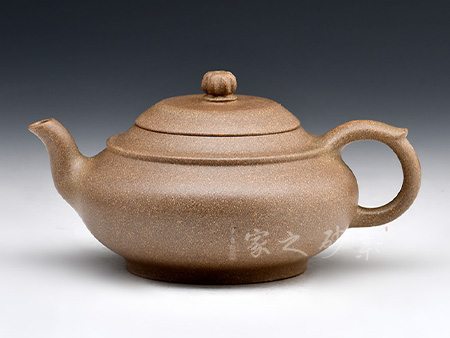 壺身圓潤(rùn)飽滿,短直暗嘴似自壺身而出,自然銜接,樣式小巧可愛;碩大圓珠鈕,倒耳型圈把。做工精致,工藝獨(dú)到,此壺傳承了傳統(tǒng)器型的精髓。