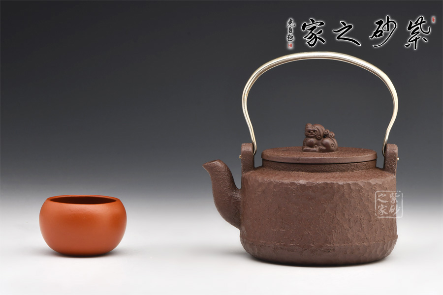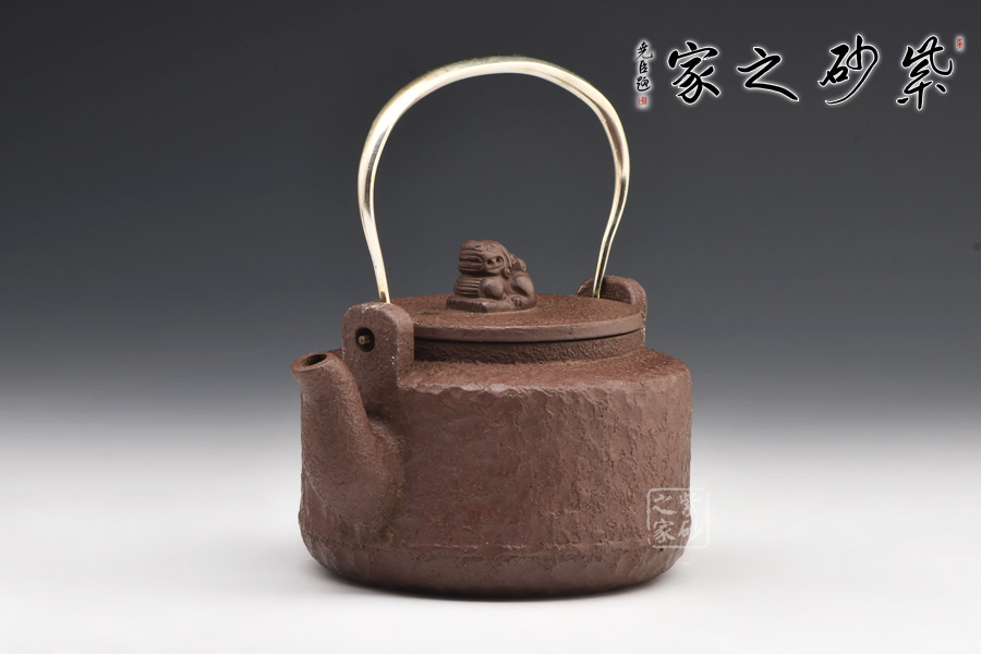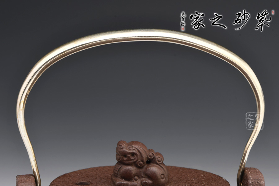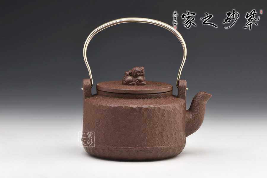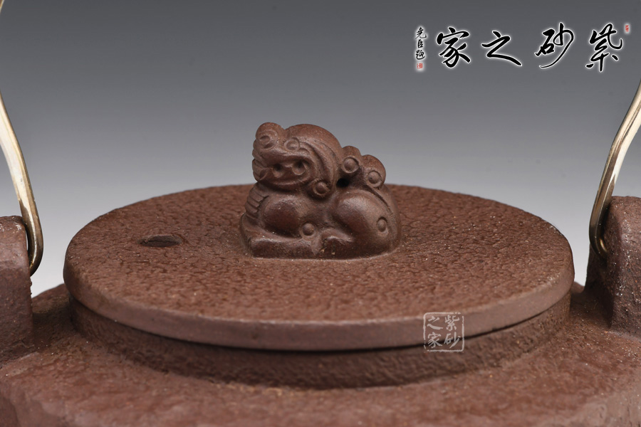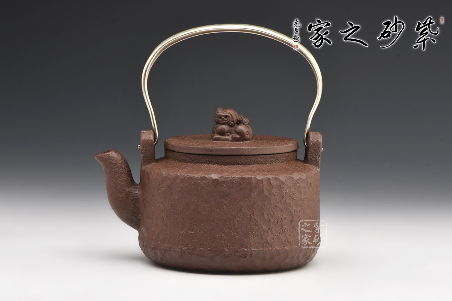 此壺為紫砂仿鐵壺,壺身仿造鐵壺捶打留下的獨有的花紋,古樸獨特。壺身呈圓柱形,造型簡約大氣,別致有感。氣韻古樸雅致,厚重的感覺給人一種蒼涼的老味,使人凝神發(fā)思。平蓋之上更是獨特,瑞獸為鈕,制作精細,呼應(yīng)主題,瑞安之意,寓意美好。金屬提梁把,線條變化有致,三流彎大氣,出水爽利,沖茗聞香,不容錯過!