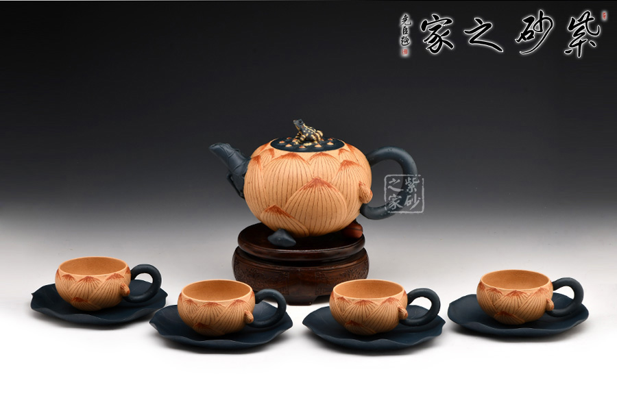 青蛙荷花套具,中國工藝美術(shù)大師蔣蓉作品,紫砂七老之一,紫砂工藝史上第一位女工藝美術(shù)師,擅長花塑器創(chuàng)作。