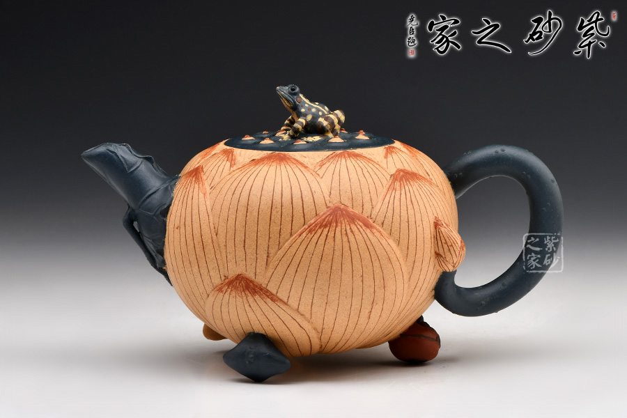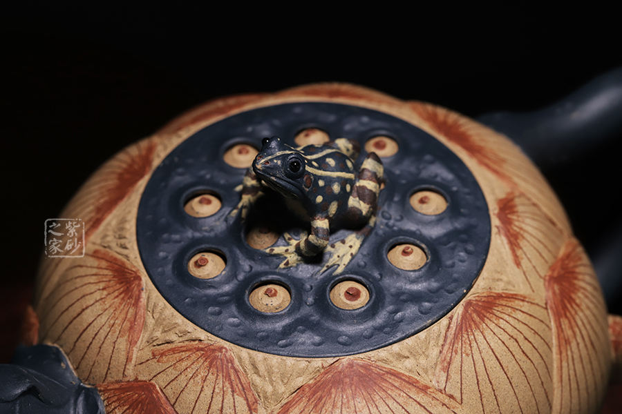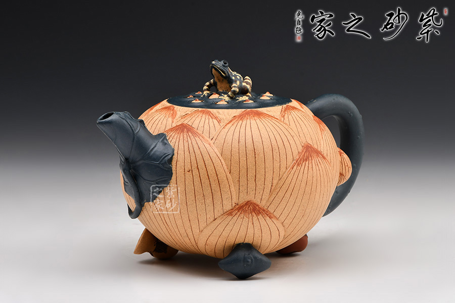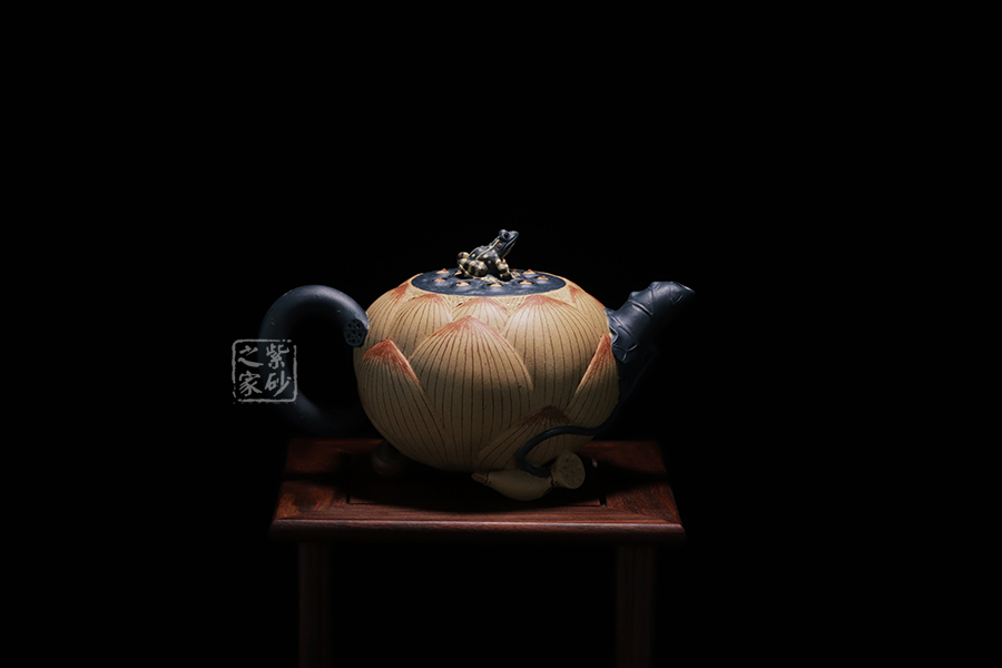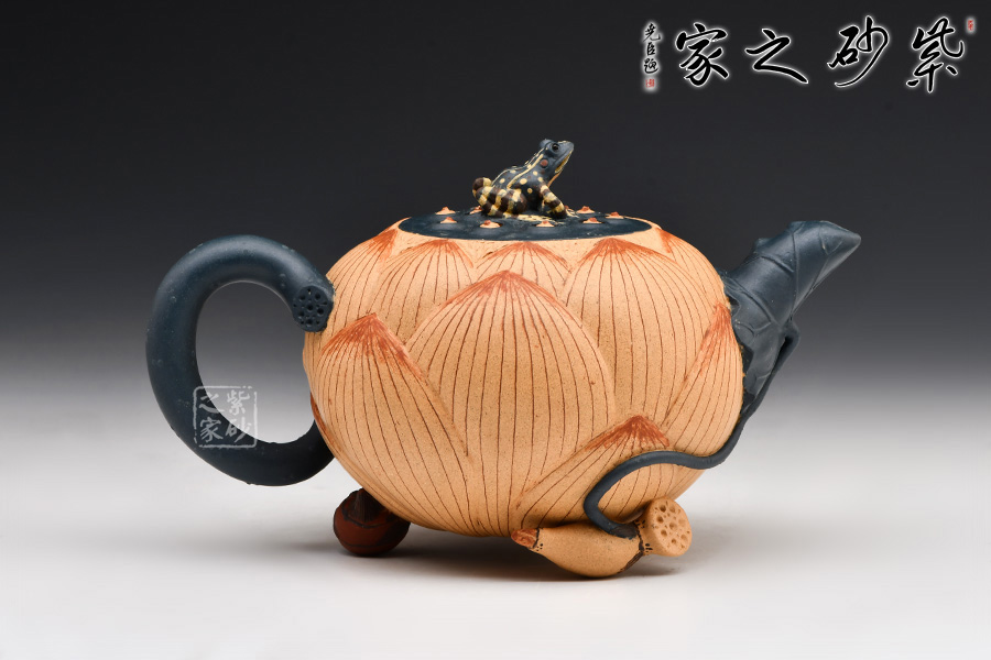 巧妙的定型也令人稱妙有加:以盛開的荷花作壺身,圓鼓鼓的蓮蓬作壺蓋,彎曲的花梗作壺把,才出水的嫩荷葉作壺嘴,巧妙地運用小青蛙作壺“的子”,真是靜中有動,動中有靜,自然天成,獨具一格。