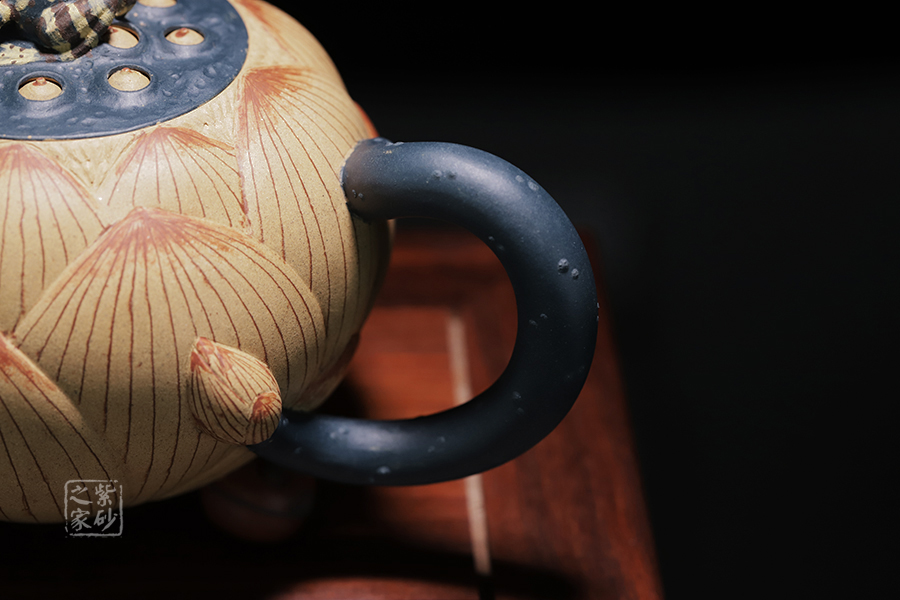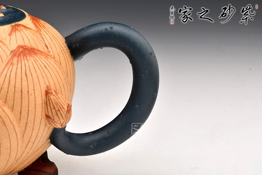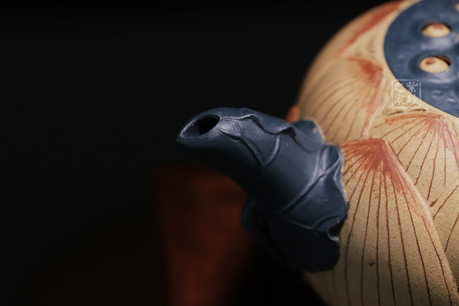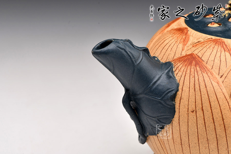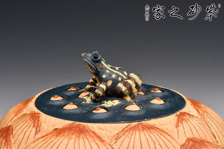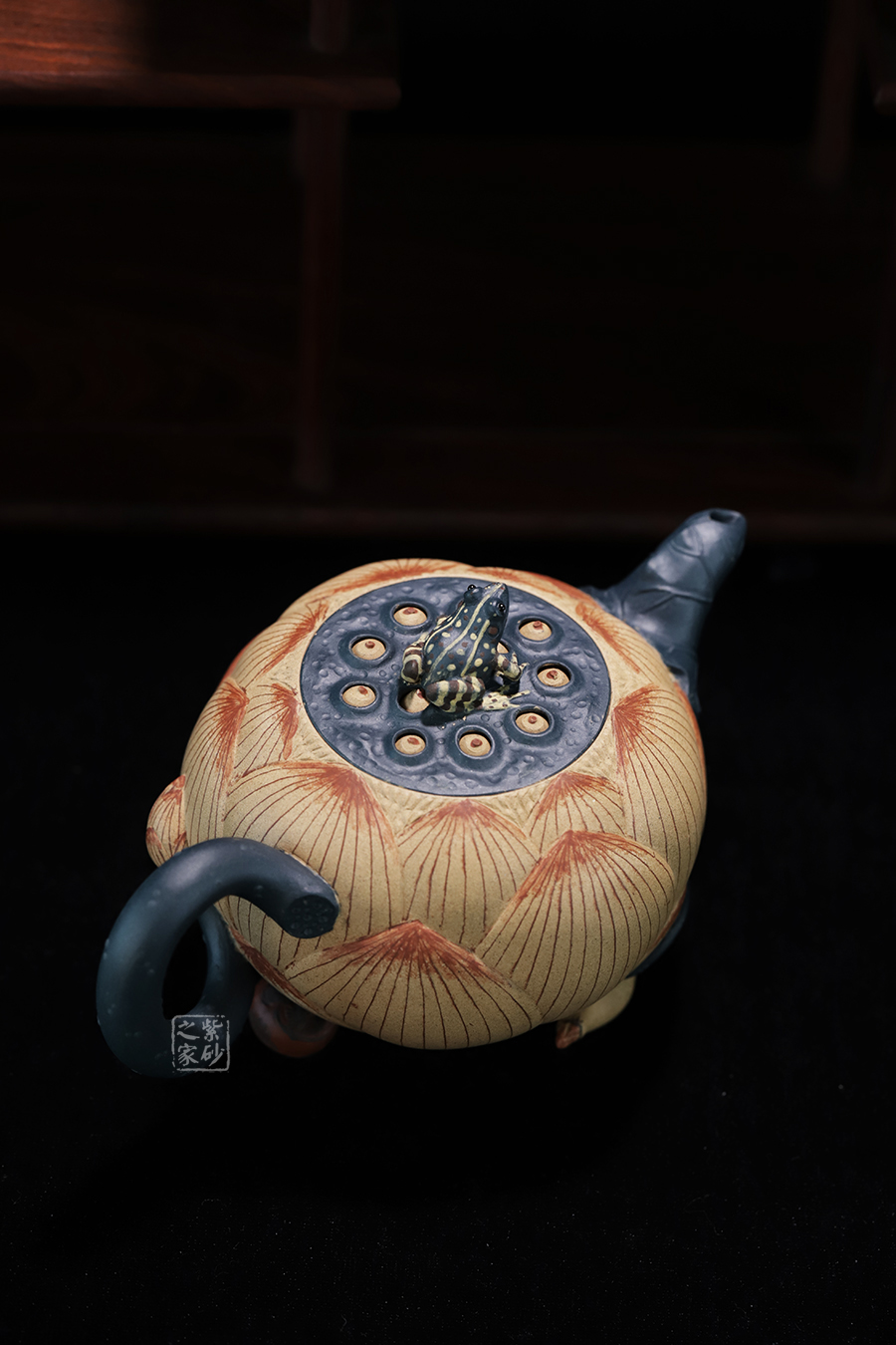 巧妙的定型也令人稱妙有加:以盛開的荷花作壺身,圓鼓鼓的蓮蓬作壺蓋,彎曲的花梗作壺把,才出水的嫩荷葉作壺嘴,巧妙地運用小青蛙作壺“的子”,真是靜中有動,動中有靜,自然天成,獨具一格。