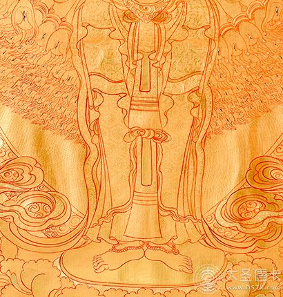 在繪制佛像服飾等位置時,用刻金技法,使圖案更具豐富的層次和立體感,用金勾勒的線條和圖案不但明亮度進一步提高,讓畫面更加燦爛,而且也使金在畫面上保持得更加長久。