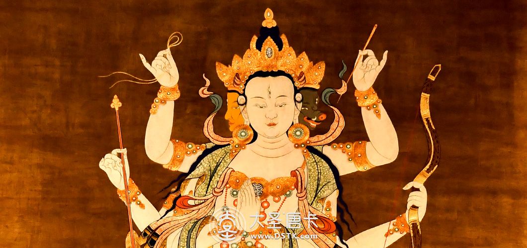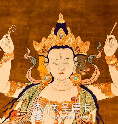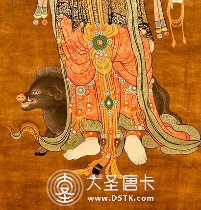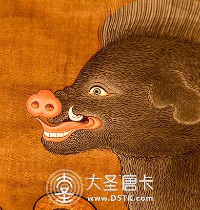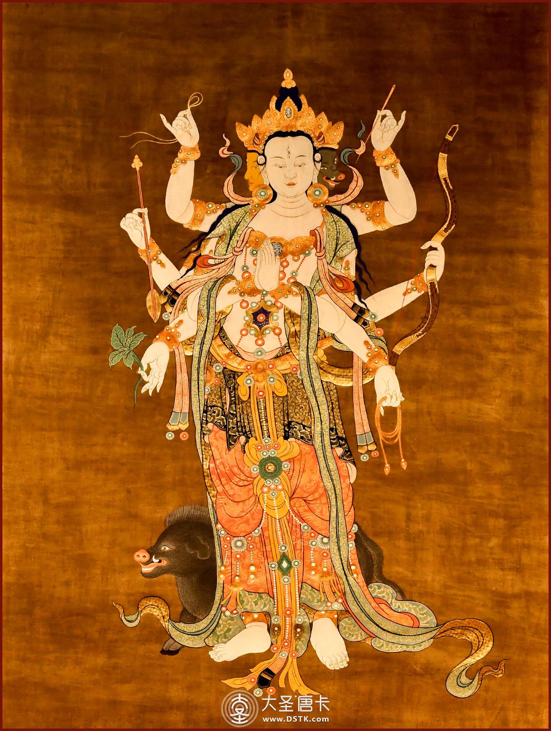 摩利支天(Marīcīdevī),意為“光”、“陽焰”。據藏傳佛教說是隱身和消災的保護神。摩利支天具備隱形自在的大神通力,能救蕓蕓眾生于危難水火之中。摩利支天在佛寺的造像為天女形象,手執(zhí)蓮花,頭頂寶塔,坐在金色的豬身上,周圍還環(huán)繞著一群豬。