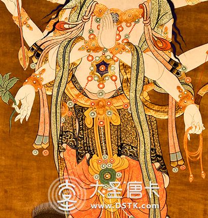 在繪制佛像服飾等位置時,用刻金技法,使圖案更具豐富的層次和立體感,用金勾勒的線條和圖案不但明亮度進一步提高,讓畫面更加燦爛,而且也使金在畫面上保持得更加長久。