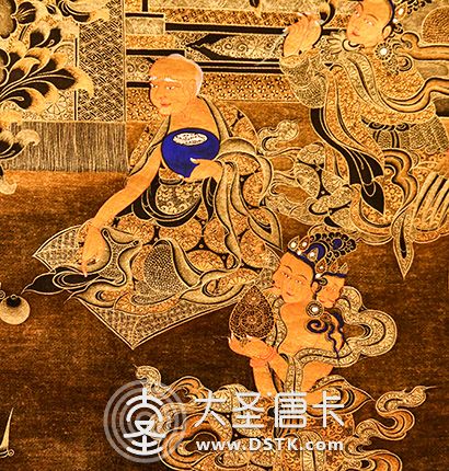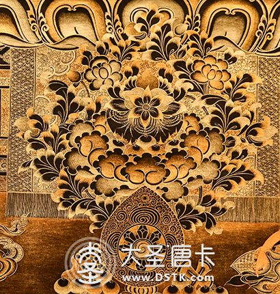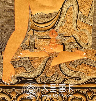 在繪制佛像服飾等位置時,用刻金技法,使圖案更具豐富的層次和立體感,用金勾勒的線條和圖案不但明亮度進一步提高,讓畫面更加燦爛,而且也使金在畫面上保持得更加長久。
