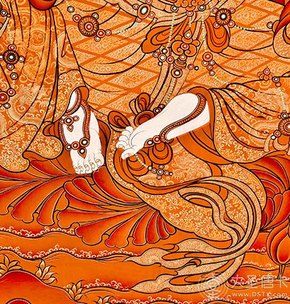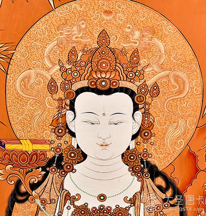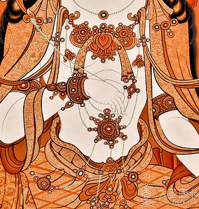 在繪制佛像服飾等位置時(shí),用刻金技法,使圖案更具豐富的層次和立體感,用金勾勒的線條和圖案不但明亮度進(jìn)一步提高,讓畫面更加燦爛,而且也使金在畫面上保持得更加長久。