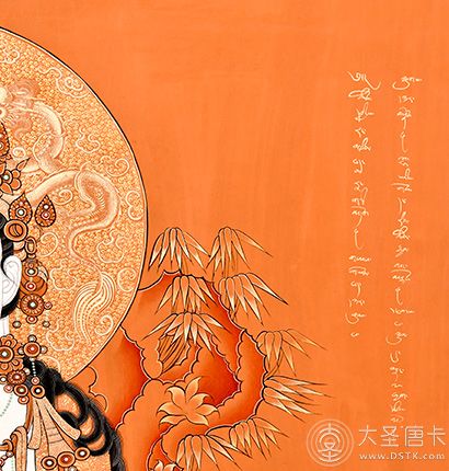 該作品在表現(xiàn)形式及構(gòu)圖和設(shè)色上吸收了漢地工筆畫的畫風(fēng),與藏傳繪畫藝術(shù)兼容并蓄,在傳統(tǒng)上加進(jìn)自己對繪畫和佛教的理解來創(chuàng)作,意境遼遠(yuǎn)。線條的繪制手法精湛,細(xì)致而不纖弱,流暢舒緩。