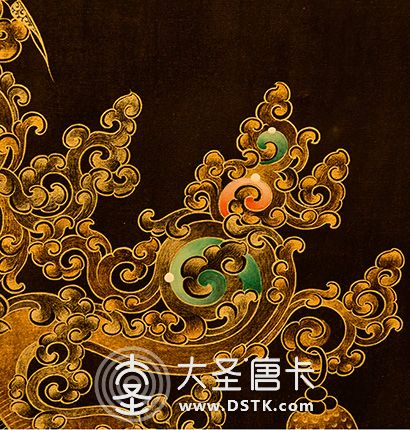在繪制佛像服飾等位置時,用刻金技法,使圖案更具豐富的層次和立體感,用金勾勒的線條和圖案不但明亮度進一步提高,讓畫面更加燦爛,而且也使金在畫面上保持得更加長久。