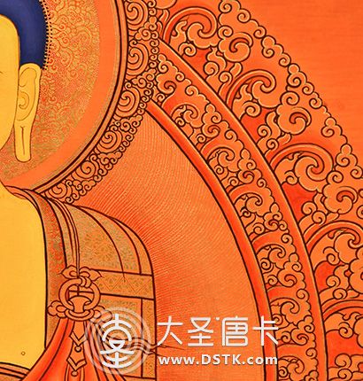 在繪制佛像服飾等位置時,用刻金技法,使圖案更具豐富的層次和立體感,用金勾勒的線條和圖案不但明亮度進一步提高,讓畫面更加燦爛,而且也使金在畫面上保持得更加長久。