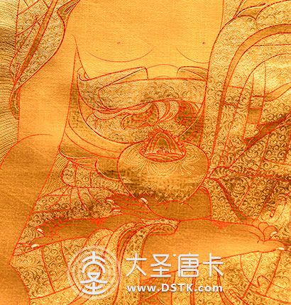 在繪制佛像服飾等位置時,用刻金技法,使圖案更具豐富的層次和立體感,用金勾勒的線條和圖案不但明亮度進一步提高,讓畫面更加燦爛,而且也使金在畫面上保持得更加長久。