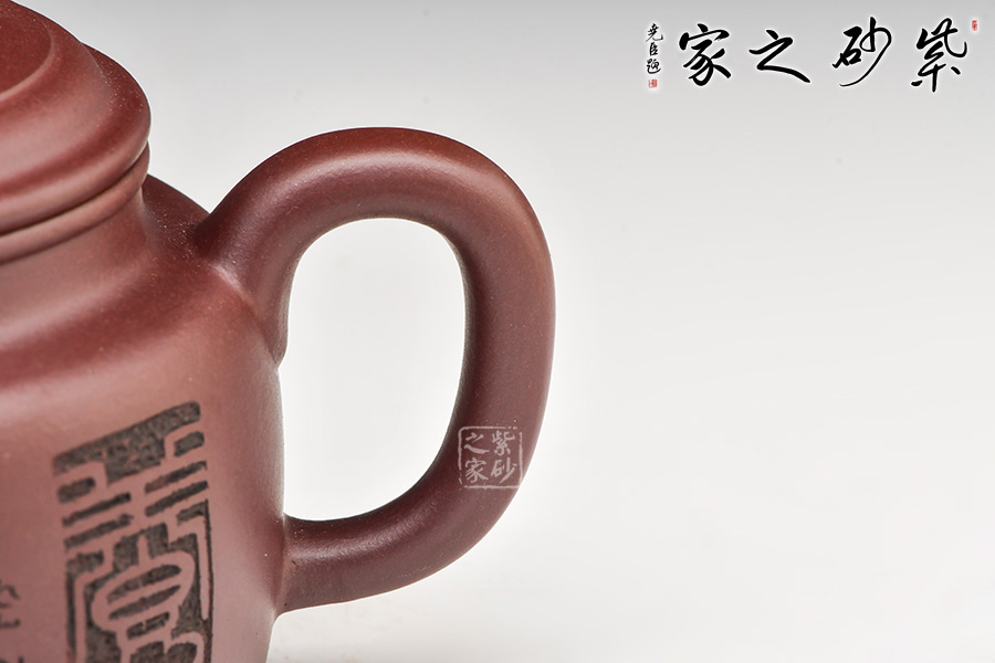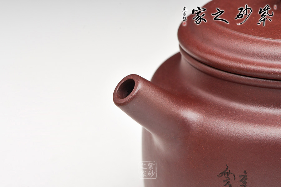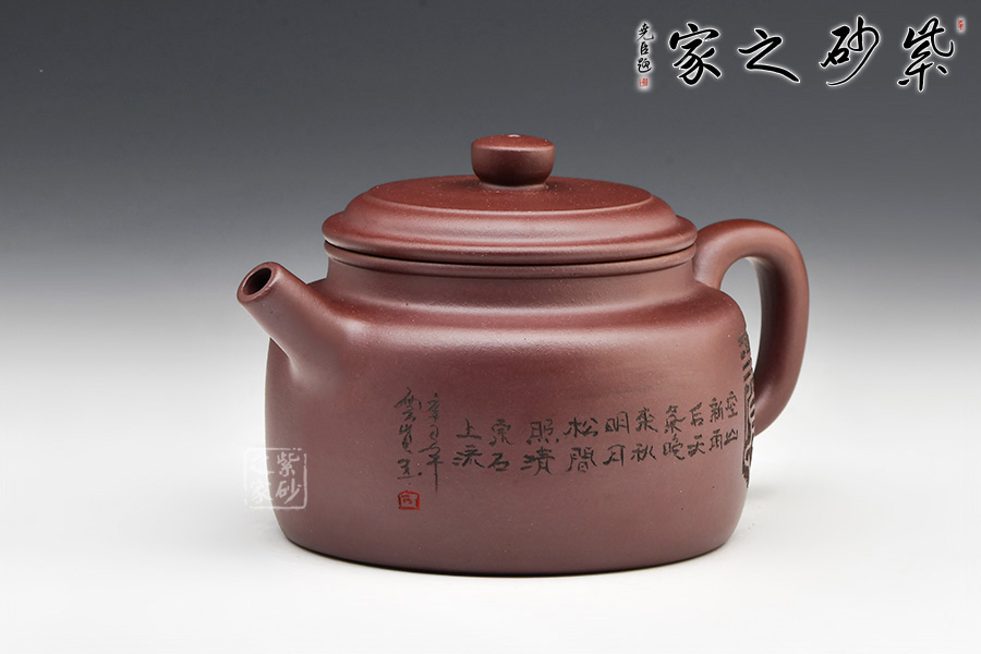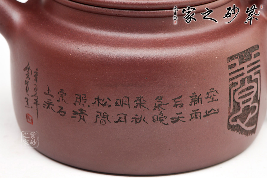 這款“德鐘”器形端莊穩(wěn)重,比例協(xié)調(diào),結(jié)構(gòu)嚴謹,造型簡潔質(zhì)樸,令人沉醉在其典雅的氣韻之中慢慢回味,采用老紫泥泥料精制而成,泥質(zhì)厚重古拙,清雅潤澤,質(zhì)感十足;暗接直流嘴別致有趣,出水迅猛有力;端把耳型樣式,端握起來舒適有力;傳統(tǒng)壓蓋嚴絲合縫,氣密性良好,扁柱鈕與壺身造型相稱。詩詞刻繪由文人氣,黃金容量,賞用皆宜。