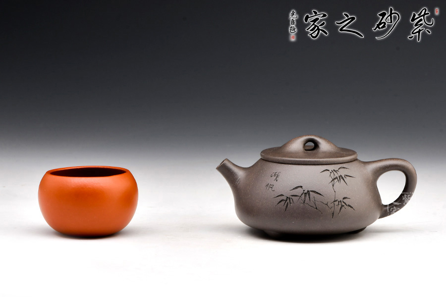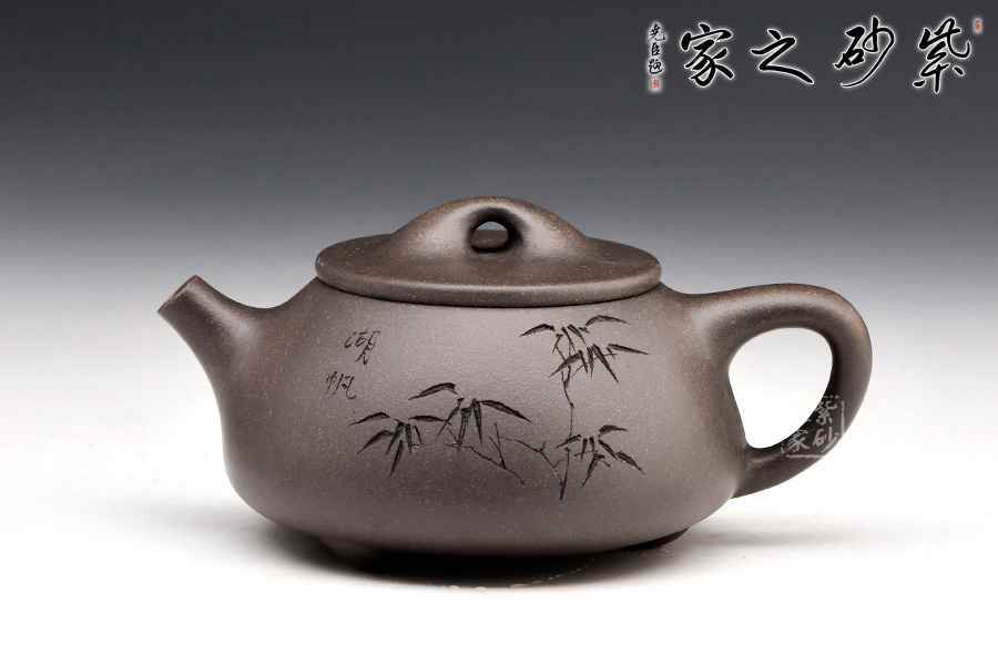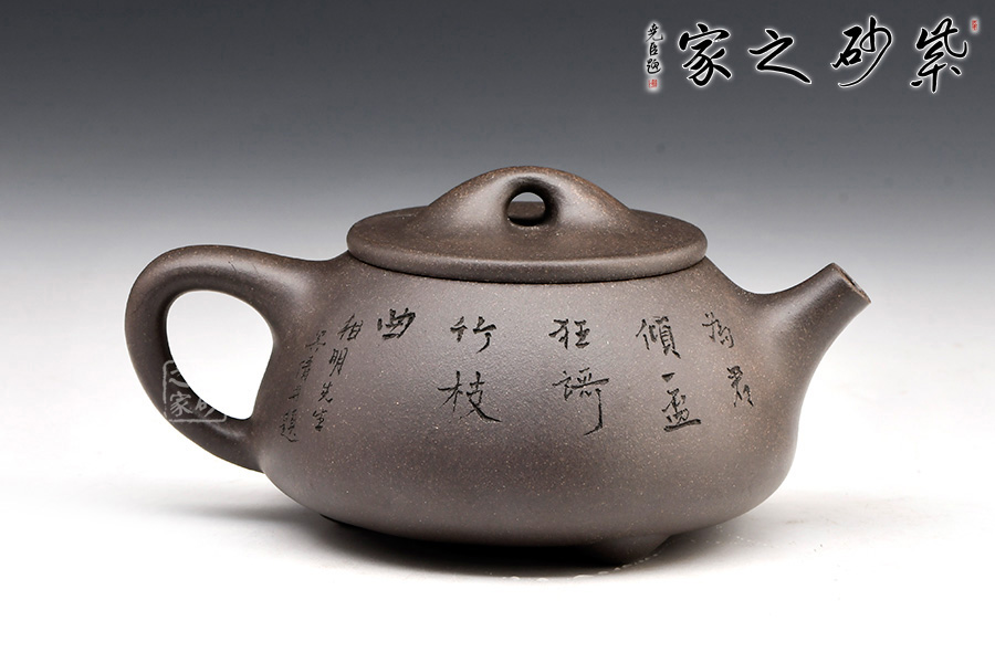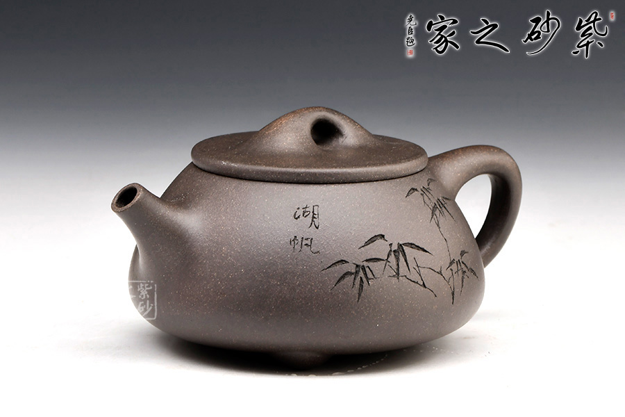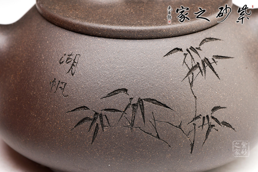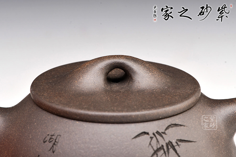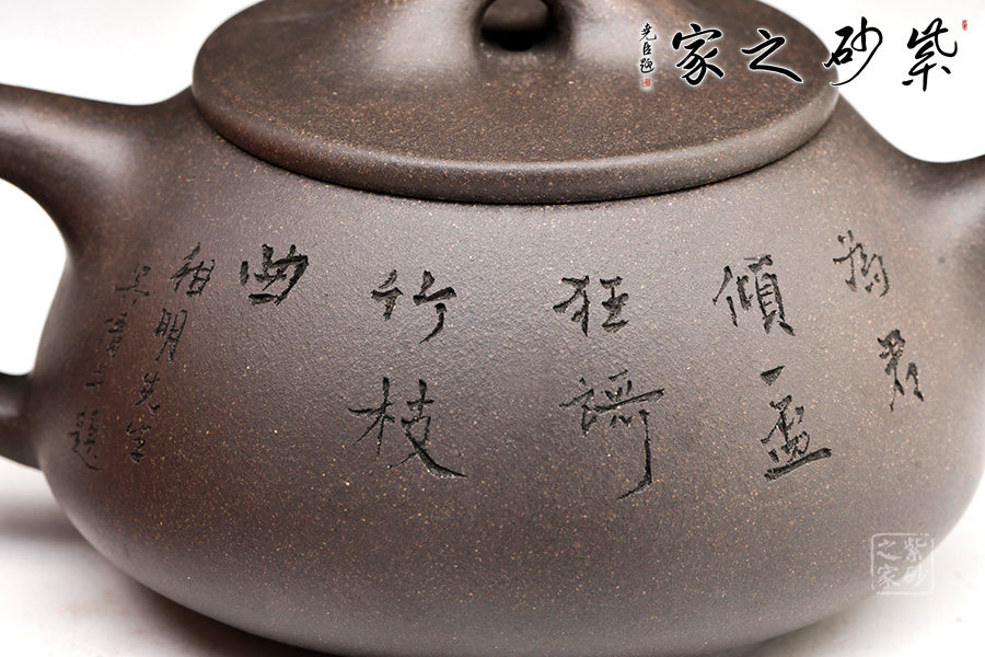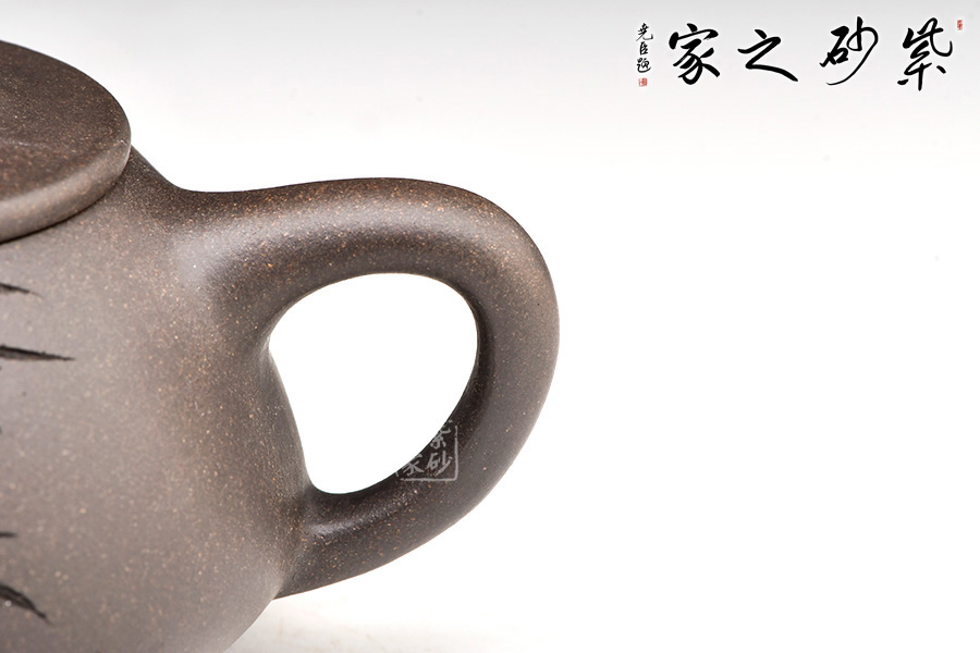 精選青灰段泥,泥質(zhì)佳,溫潤(rùn)質(zhì)感佳。整壺體點(diǎn)、線、面的過(guò)渡轉(zhuǎn)折交待清楚與流暢。面,須光則光,須毛則毛;線,須直則直,須曲則曲;點(diǎn),須方則方,須圓則圓,無(wú)半點(diǎn)含糊。此器型是老師擅長(zhǎng)的器型。此壺下大上小呈三角形的石瓢形,周身皆以圓弧線條構(gòu)成,嘴、把、的處處銜接自然流暢,線條利落明確??傮w上感覺(jué)壺形自然,筆挺、光滑而有質(zhì)感。刻繪致敬相明石瓢,值得賞用。